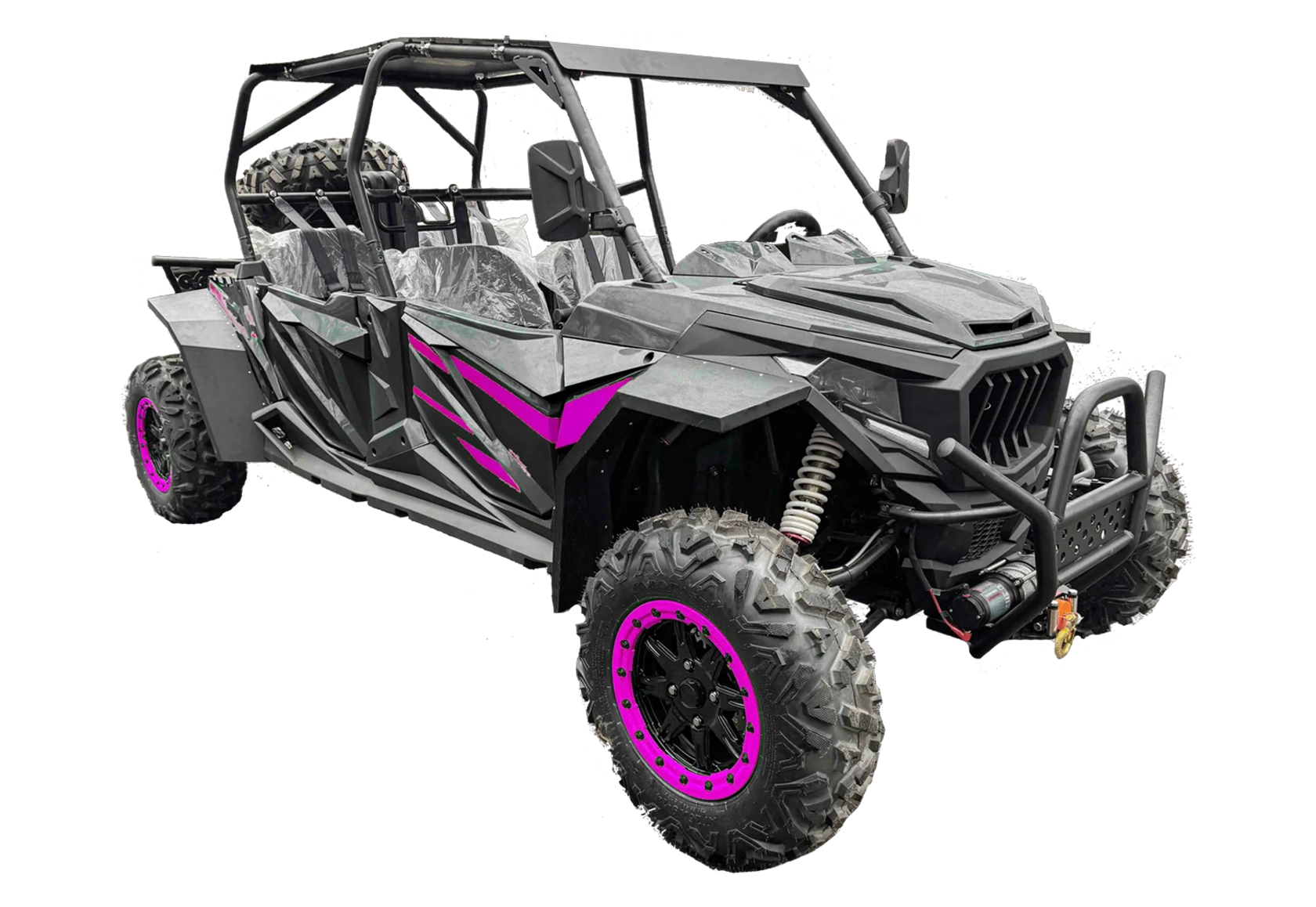 Четырехместный баггиДля тех, кто любит путешествовать компанией по бездорожью, представлен четырехместный багги – мощный, вместительный и готовый к любым испытаниям.Сердце багги – надежный V-образный двухцилиндровый двигатель (799 см³, 59 л.с.) с жидкостным охлаждением, обеспечивающий стабильную работу в самых сложных условиях. Использует АИ-92, что делает эксплуатацию экономичной.Превосходная проходимость – благодаря вариаторной трансмиссии с возможностью переключения между 2WD и 4WD и передним дифференциалом. Независимая подвеска с двойными А-образными рычагами и ходом 110 мм (спереди) / 95 мм (сзади) гарантирует плавный ход по бездорожью. Опционально доступны азотные амортизаторы для повышенной выносливости.26-дюймовые шины (26x10 R14) с легкосплавными дисками и гидравлическими тормозами обеспечивают уверенное движение и контроль в любых условиях. Клиренс 29 см позволяет преодолевать серьезные препятствия, а электрическая лебедка на 1600 кг выручит в сложных ситуациях.Комфорт и управляемость:Электроусилитель руля (EPS) – легкое и точное управление.