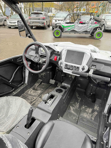 Двухместный баггиГотовы покорять бездорожье с комфортом? Наш двухместный багги – это идеальный спутник для охоты, рыбалки, экспедиций и экстремальных приключений. С мощным V-образным двигателем (799 см³, 59 л.с.) и жидкостным охлаждением он легко справляется с грязью, песком и снегом, работая на доступном АИ-92.Превосходная проходимость обеспечивается вариаторной трансмиссией с возможностью переключения между 2WD и 4WD, а также передним дифференциалом для лучшего сцепления. Независимая подвеска с двойными А-образными рычагами и ходом 110 мм (спереди) / 95 мм (сзади) гарантирует плавность хода даже на сложном рельефе. Опционально доступны азотные амортизаторы для еще большей выносливости.26-дюймовые шины (26x8 R14) с легкосплавными дисками и гидравлическими тормозами обеспечивают уверенное движение и мгновенную остановку. Клиренс 29 см позволяет преодолевать серьезные препятствия, а электрическая лебедка на 1600 кг выручит в самых сложных ситуациях.Комфорт и управляемость:Электроусилитель руля (EPS) – легкое и точное управление.
