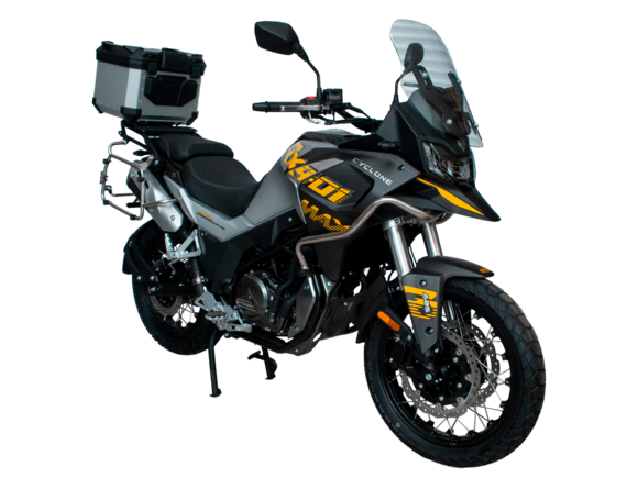 Мотоцикл CYCLONE RX401 (SR400GY-2D) – туристический эндуро, готовый бросить вызов любым дорогам и расстояниям. За рулём этого мотоцикла для вас не будет невозможных маршрутов. Его агрессивный дизайн всецело соответствует традициям жанра данного класса мототехники.Рядный двухцилиндровый четырёхтактный двигатель объёмом 401 см3 выдаёт 43 л.с. на 9500 об/мин. Максимальный крутящий момент достигается на 8000 об/мин и составляет 37 Н·м. Инжекторный впрыск топлива с блоком управления BOSCH увеличивает топливную экономичность, а также позволяет добиться высокой приёмистости и неприхотливости агрегата. Жидкостная система охлаждения не допустит перегрева двигателя даже при самом агрессивном вождении. На мотоцикл 6-ступенчатая механическая коробка передач.Максимальная скорость мотоцикла составляет 139 км/ч.RX401 оснащён спицованными алюминиевыми колёсами диаметром 17 и 19 дюймов. Колёса обуты в бескамерные покрышки от фирмы CST. С неровностями дороги эффективно справляются телескопическая вилка перевёрнутого типа спереди и маятник с моноамортизатором сзади. Ход передней подвески составляет 130 мм, задней – 55 мм. Оба компонента подвески являются регулируемыми. Эффективное и безопасное замедление с любых скоростей обеспечивают гидравлические дисковые тормоза с двухканальной системой ABS спереди и сзади.Клиренс мотоцикла составляет 185 мм. Объём топливного бака – 20 л. Снаряжённая масса – 215 кг.Мотоцикл отличает хорошо продуманная компоновка с высоко расположенным радиатором. На данной модели штатно установлены дуги безопасности, защита картера и двигателя, а также багажник с креплениями для боковых кофров. Кроме того, мотоцикл снабжён центральной подножкой для лёгкого обслуживания цепи, колес и вилки.Бортовой компьютер оборудован цветным дисплеем привлекательного дизайна со специальным защитным козырьком, спасающим от брызг и бликов. Из других приятных мелочей в допоборудовании мотоцикла стоит выделить 12-вольтовую розетку, подсветку пультов и USB-порт.Мотоцикл сочетает в себе отличные технические характеристики, комфорт и надёжность, что позволяет вам ощутить настоящую свободу на любой дороге с любым покрытием.