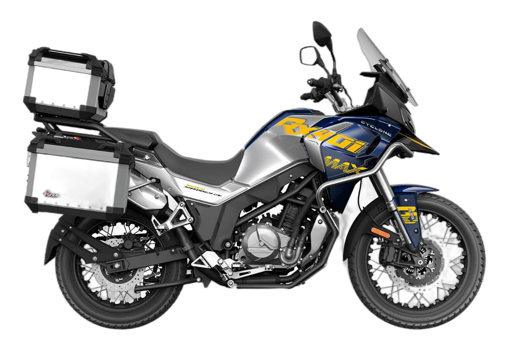 Мотоцикл CYCLONE RX401 (SR400GY-2D) – туристический эндуро, готовый бросить вызов любым дорогам и расстояниям. За рулём этого мотоцикла для вас не будет невозможных маршрутов. Его агрессивный дизайн всецело соответствует традициям жанра данного класса мототехники.Рядный двухцилиндровый четырёхтактный двигатель объёмом 401 см3 выдаёт 43 л.с. на 9500 об/мин. Максимальный крутящий момент достигается на 8000 об/мин и составляет 37 Н·м. Инжекторный впрыск топлива с блоком управления BOSCH увеличивает топливную экономичность, а также позволяет добиться высокой приёмистости и неприхотливости агрегата. Жидкостная система охлаждения не допустит перегрева двигателя даже при самом агрессивном вождении. На мотоцикл 6-ступенчатая механическая коробка передач.Максимальная скорость мотоцикла составляет 139 км/ч.RX401 оснащён спицованными алюминиевыми колёсами диаметром 17 и 19 дюймов. Колёса обуты в бескамерные покрышки от фирмы CST. С неровностями дороги эффективно справляются телескопическая вилка перевёрнутого типа спереди и маятник с моноамортизатором сзади. Ход передней подвески составляет 130 мм, задней – 55 мм. Оба компонента подвески являются регулируемыми. Эффективное и безопасное замедление с любых скоростей обеспечивают гидравлические дисковые тормоза с двухканальной системой ABS спереди и сзади.Клиренс мотоцикла составляет 185 мм. Объём топливного бака – 20 л. Снаряжённая масса – 215 кг.Мотоцикл отличает хорошо продуманная компоновка с высоко расположенным радиатором. На данной модели штатно установлены дуги безопасности, защита картера и двигателя, а также багажник с креплениями для боковых кофров. Кроме того, мотоцикл снабжён центральной подножкой для лёгкого обслуживания цепи, колес и вилки.Бортовой компьютер оборудован цветным дисплеем привлекательного дизайна со специальным защитным козырьком, спасающим от брызг и бликов. Из других приятных мелочей в допоборудовании мотоцикла стоит выделить 12-вольтовую розетку, подсветку пультов и USB-порт.Мотоцикл сочетает в себе отличные технические характеристики, комфорт и надёжность, что позволяет вам ощутить настоящую свободу на любой дороге с любым покрытием.