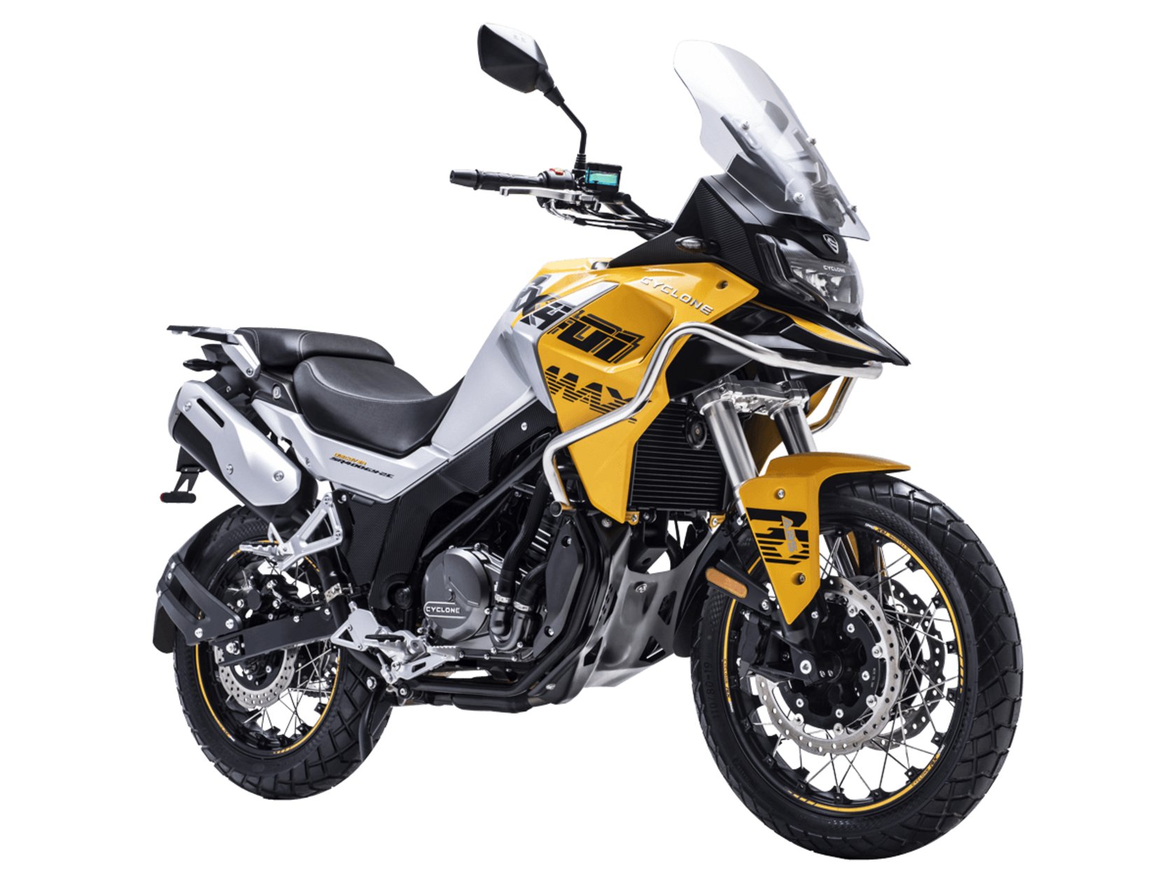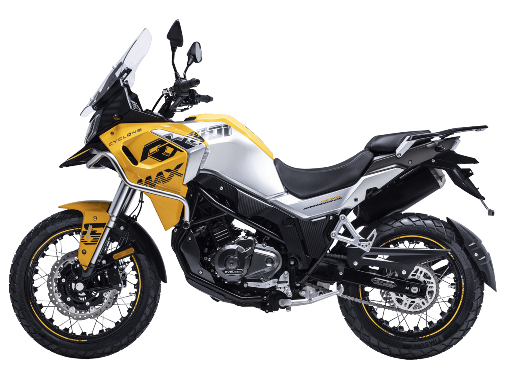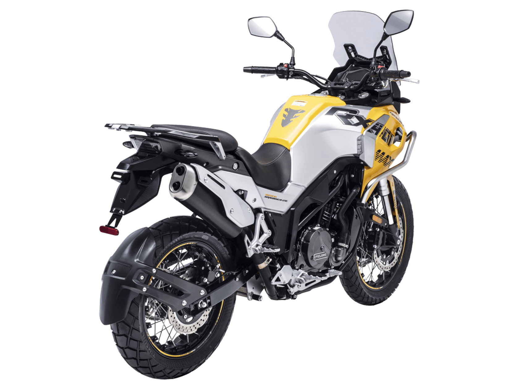 Мотоцикл CYCLONE RX401 (SR400GY-2D) – туристический эндуро, готовый бросить вызов любым дорогам и расстояниям. За рулём этого мотоцикла для вас не будет невозможных маршрутов. Его агрессивный дизайн всецело соответствует традициям жанра данного класса мототехники.Рядный двухцилиндровый четырёхтактный двигатель объёмом 401 см3 выдаёт 43 л.с. на 9500 об/мин. Максимальный крутящий момент достигается на 8000 об/мин и составляет 37 Н·м. Инжекторный впрыск топлива с блоком управления BOSCH увеличивает топливную экономичность, а также позволяет добиться высокой приёмистости и неприхотливости агрегата. Жидкостная система охлаждения не допустит перегрева двигателя даже при самом агрессивном вождении. На мотоцикл 6-ступенчатая механическая коробка передач.Максимальная скорость мотоцикла составляет 139 км/ч.RX401 оснащён спицованными алюминиевыми колёсами диаметром 17 и 19 дюймов. Колёса обуты в бескамерные покрышки от фирмы CST. С неровностями дороги эффективно справляются телескопическая вилка перевёрнутого типа спереди и маятник с моноамортизатором сзади. Ход передней подвески составляет 130 мм, задней – 55 мм. Оба компонента подвески являются регулируемыми. Эффективное и безопасное замедление с любых скоростей обеспечивают гидравлические дисковые тормоза с двухканальной системой ABS спереди и сзади.Клиренс мотоцикла составляет 185 мм. Объём топливного бака – 20 л. Снаряжённая масса – 215 кг.Мотоцикл отличает хорошо продуманная компоновка с высоко расположенным радиатором. На данной модели штатно установлены дуги безопасности, защита картера и двигателя, а также багажник с креплениями для боковых кофров. Кроме того, мотоцикл снабжён центральной подножкой для лёгкого обслуживания цепи, колес и вилки.Бортовой компьютер оборудован цветным дисплеем привлекательного дизайна со специальным защитным козырьком, спасающим от брызг и бликов. Из других приятных мелочей в допоборудовании мотоцикла стоит выделить 12-вольтовую розетку, подсветку пультов и USB-порт.Мотоцикл сочетает в себе отличные технические характеристики, комфорт и надёжность, что позволяет вам ощутить настоящую свободу на любой дороге с любым покрытием.