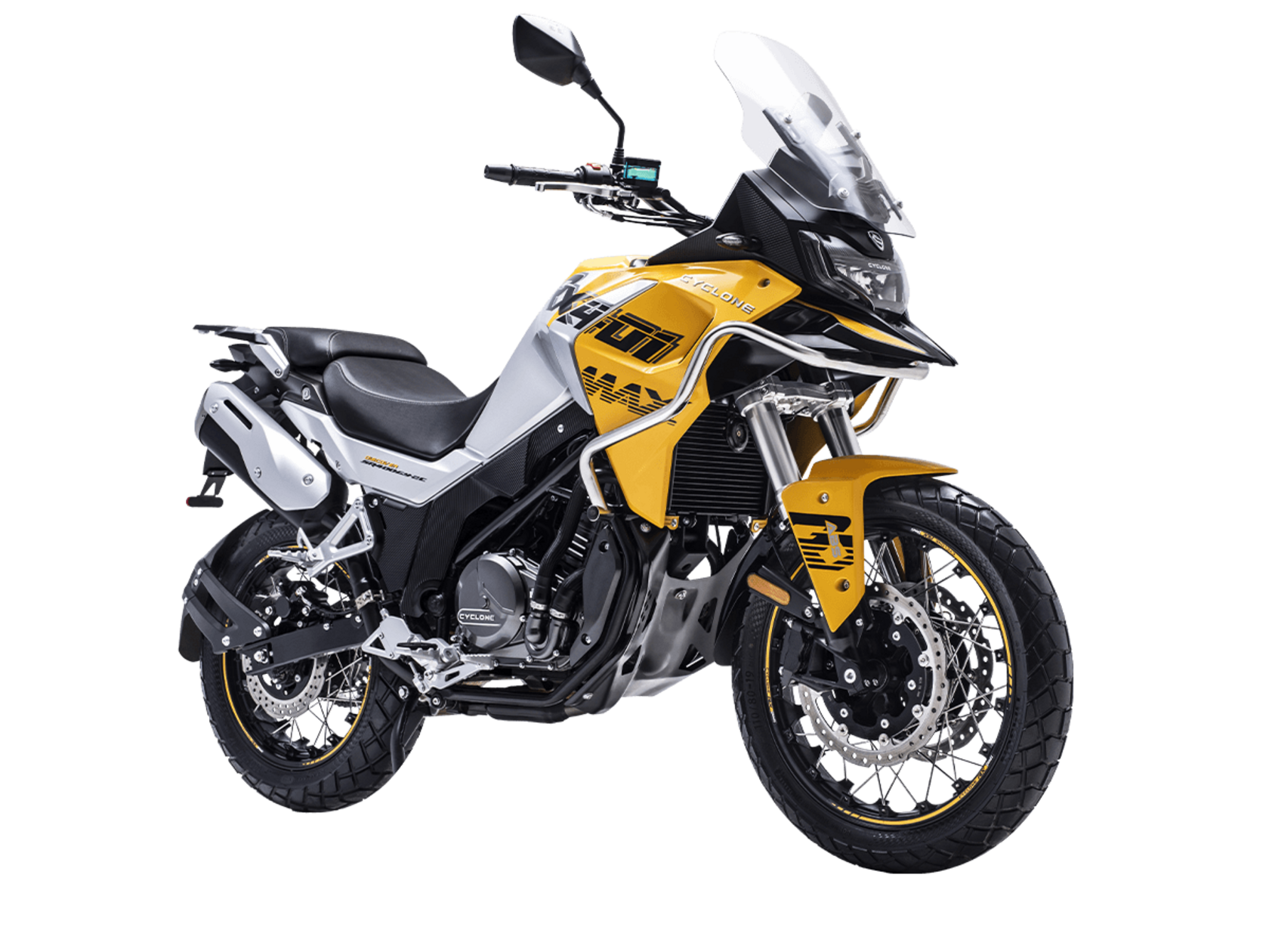 Мотоцикл CYCLONE RX401 2025 – туристический эндуро, готовый бросить вызов любым дорогам и расстояниям. За его рулём для вас не будет невозможных маршрутов!Оснащён рядным 2-цилиндровым 4-тактным двигателем DOHC объёмом 401 см³ с 4 клапанами на каждом цилиндре. Двигатель способен обеспечить мощность в 42,8 л.с. при 9500 об/мин, а максимальный крутящий момент 37 Н·м достигается на 8000 об/мин. Соотношение диаметра цилиндра и хода поршня 68х55,2 мм. Степень сжатия 11,6:1.Жидкостная система охлаждения не допустит перегрева двигателя даже при самом агрессивном вождении. Механическая коробка передач имеет 6 ступеней со схемой 1-N-2-3-4-5-6. Объём топливного бака 20 литров.Максимальная скорость мотоцикла 139 км/ч.Мотоцикл оснащён спицованными алюминиевыми колёсами диаметром 19 дюймов спереди и 17 сзади. Колёса обуты в бескамерные покрышки CST. В качестве передней подвески используется телескопическая вилка перевёрнутого типа, а сзади установлен маятник с моноамортизатором. Ход передней подвески 130 мм, задней – 55 мм. Оба компонента подвески регулируются. Для эффективного торможения используются гидравлические дисковые тормоза с 2-канальной ABS системой. Тормоза спереди представлены 2 тормозными дисками диаметром 305 мм с 4-поршневыми саппортами, а сзади расположен тормозной диск 258 мм с однопоршневым суппортом с плавающей скобой.Мотоцикл имеет продуманную конструкцию с высоко расположенным радиатором.Для освещения и сигнальных огней используется диодная светотехника. Данные от бортового компьютера выводятся на яркий цветной дисплей, оснащённый специальным козырьком для защиты от брызг и бликов. Имеются подсветка пультов, USB-порт, 12-вольтная розетка.Габариты 2160x860x1395 мм, снаряжённая масса 215 кг. Колёсная база 1410 мм, клиренс 185 мм, высота по седлу 810 мм.