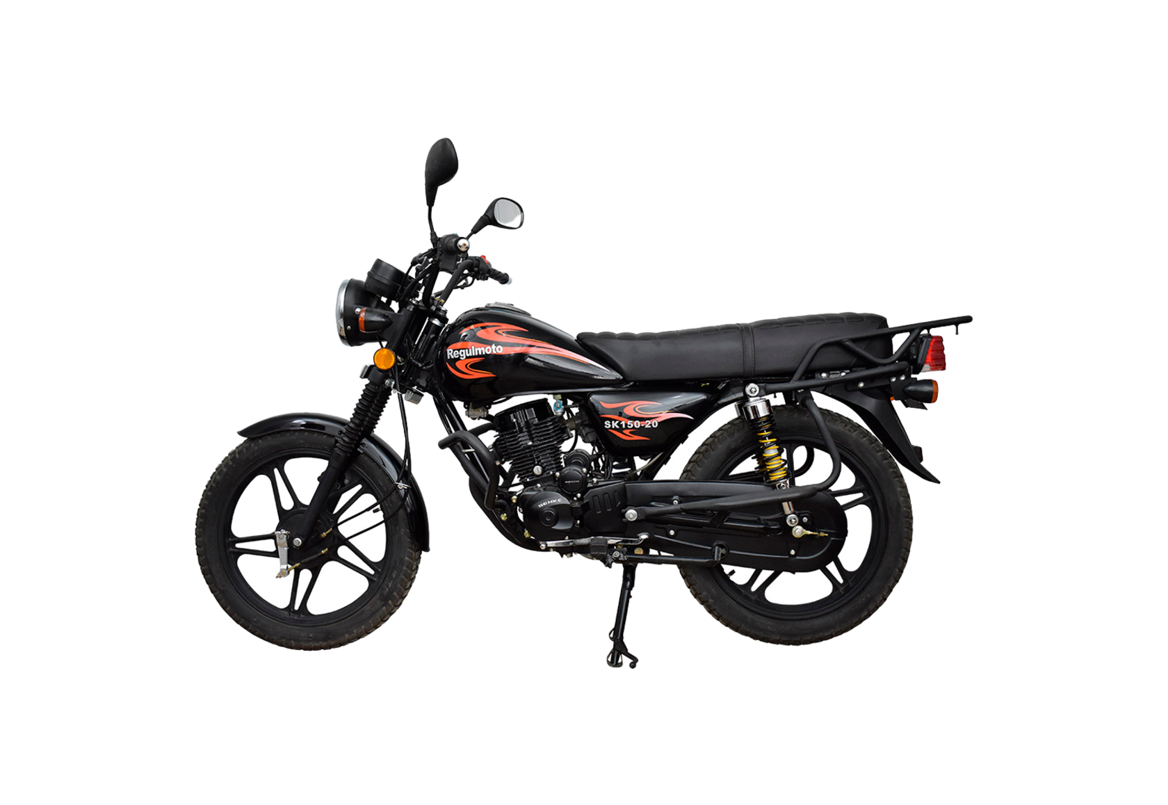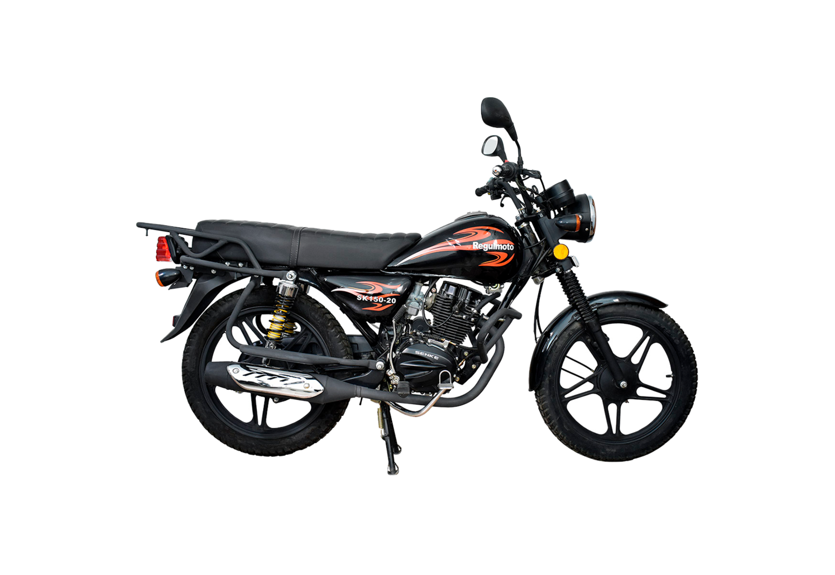 Мотоцикл Regulmoto SK 150-20 – еще один представитель линейки классических байков с малокубатурным двигателем, выпускаемый крупнейшим китайским производителем мототехники Senke. Кроме демократичной цены данный мотоцикл отличают высокая надежность узлов и агрегатов, простота повседневной эксплуатации и доступность компонентов, необходимых для сервисного обслуживания.В крепкой раме Regulmoto SK 150-20 установлен 4-тактный одноцилиндровый двигатель рабочим объемом в 150 см3 с воздушным охлаждением, который в паре с дроссельным карбюратором демонстрирует максимальную мощность чуть больше 12 лошадиных сил. Подвеска мотоцикла представлена телескопической вилкой спереди и маятником с двумя амортизаторами сзади.Вместительный бак, дуги безопасности, проверенные временем барабанные тормоза на переднем и заднем колесах, защитный кожух цепи, широкое и длинное сиденье и интегрированные в раму пассажирские подножки – все эти детали выдают утилитарное предназначение мотоцикла. Несмотря на классический «настрой», Regulmoto SK 150-20 отличается наличием массы актуальных решений: литые диски колес, современная приборная панель, световое оборудование на светодиодах, тумблер электростартера и остановки двигателя (кик-стартер также присутствует).Выбрав Regulmoto SK 150-20, вы получите надежный двухколесный транспорт на каждый день, который отличается превосходной управляемостью, высокой практичностью и простотой сервисного обслуживания без дорогостоящих вложений. Этот классический дорожник способен стать надежным партнером как опытному, так и начинающему мотоциклисту.