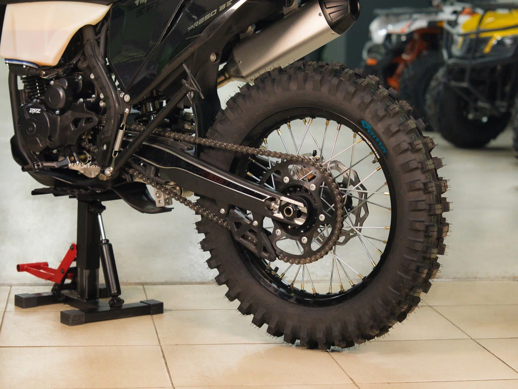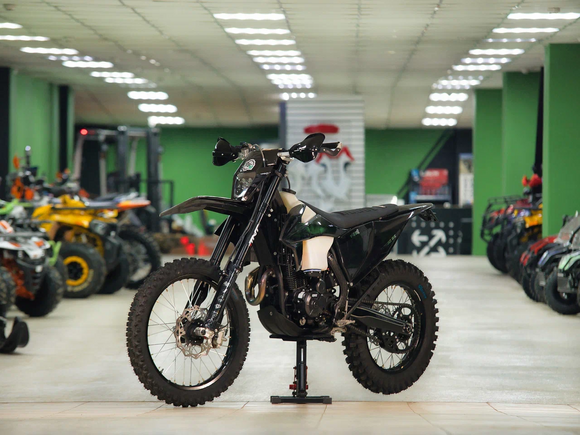 Комплектация Руль 28мм. Короткоходная ручка газа. Цепь 520. Алюминиевая литая лапка КПП, боковые накладки на рамы. Счетчик моточасов, приборная панель. Стоп сигнал, Грипсы Lock on, Защита рук Алюминиевая с пластиковыми щитками, Пластиковая защита радиатора.