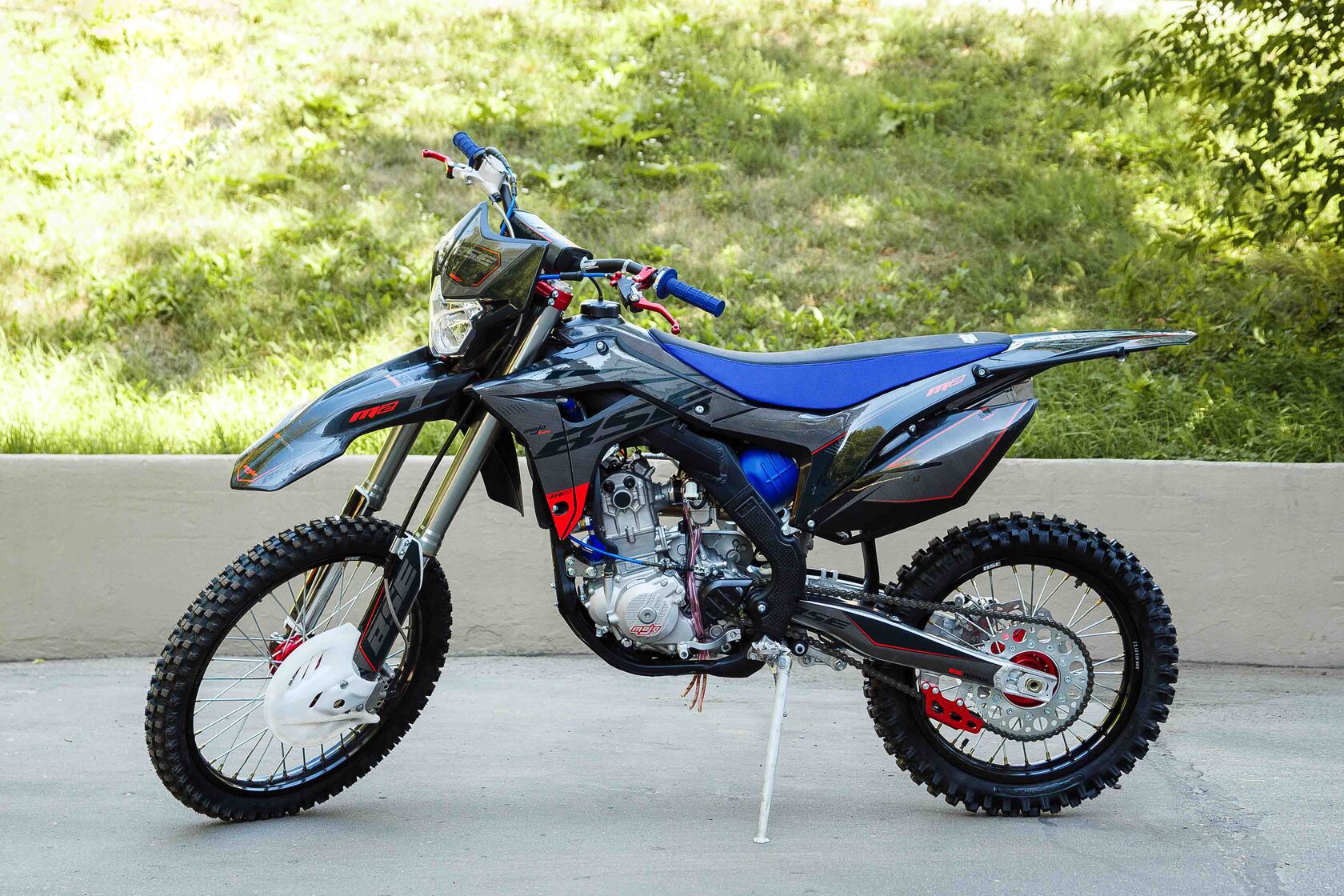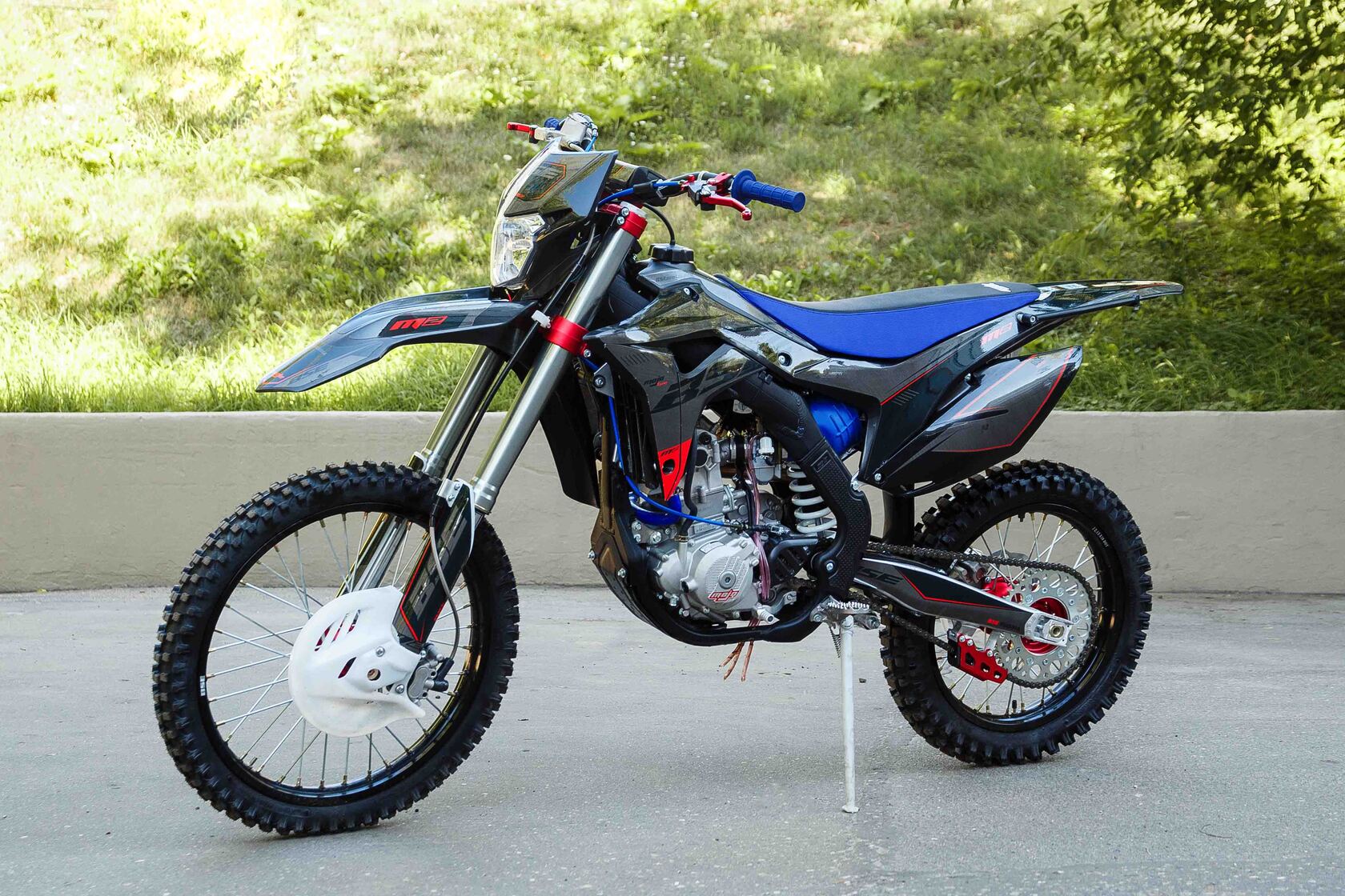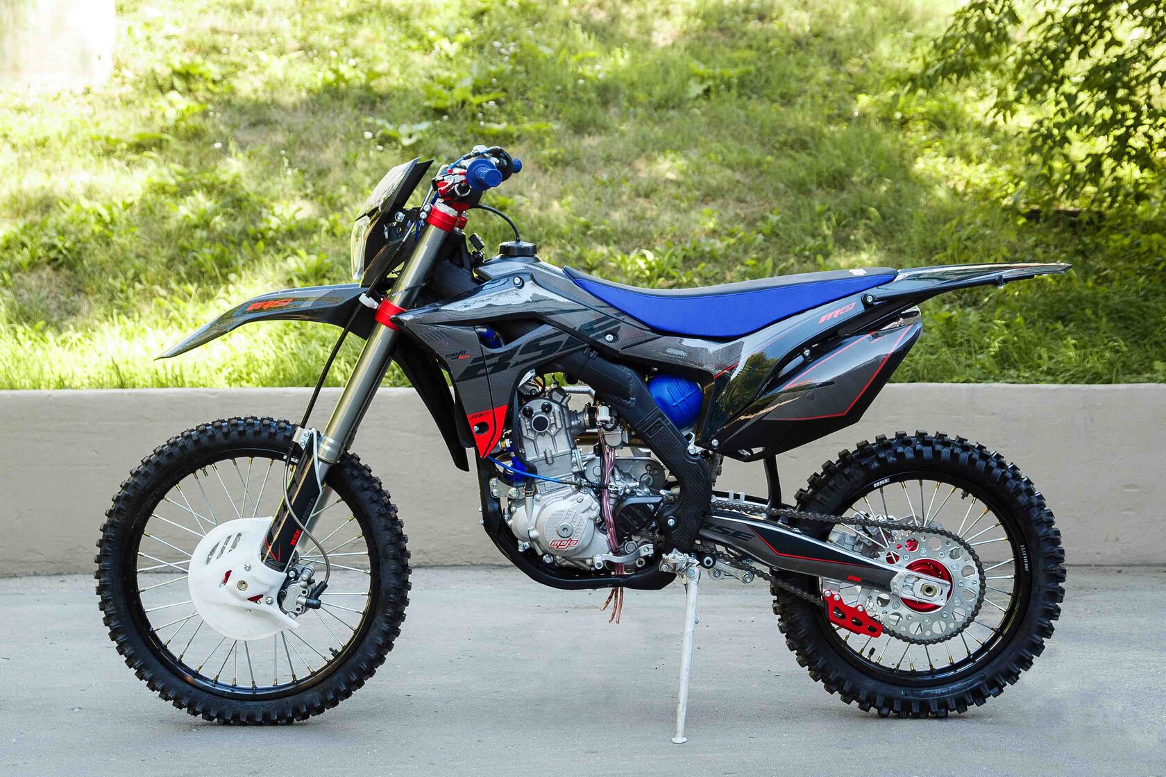 Рама алюминиевая сваренная роботизированным способом, поэтому швы и проварка не вызывает нареканий, геометрия и профиль сварных элементов являются копией рамы Honda crf 250. В базе установлена защита картера.Шасси: Вилка перевернутого типа с регулировкой отбоя, сзади алюминиевый маятник связанный с задним амортизатором через систему линков (pro-link), амортизатор рюкзачного типа длиной 480 мм, с регулировками отбоя, сжатия и пред нагрузкой. Двигатель ZS177MM 250 см3, 4 клапанный, водяного охлаждения, мощностью 27 л.с. производства компании Zongshen с электро и кик стартером.Траверсы, ступицы, звезда, анодированы в красный. Передний и задний диск имеет пластиковую защиту.У нас Вы можете купить этот мотоцикл с бесплатной доставкой по РФ и гарантией до года. Также его можно приобрести в рассрочку или в кредит.