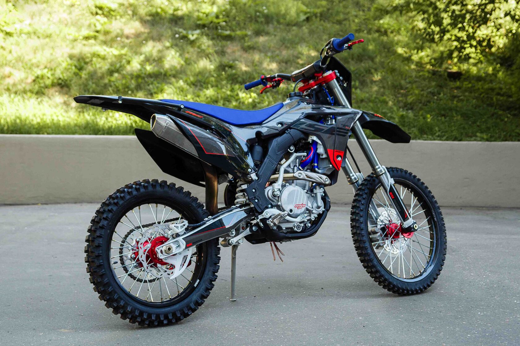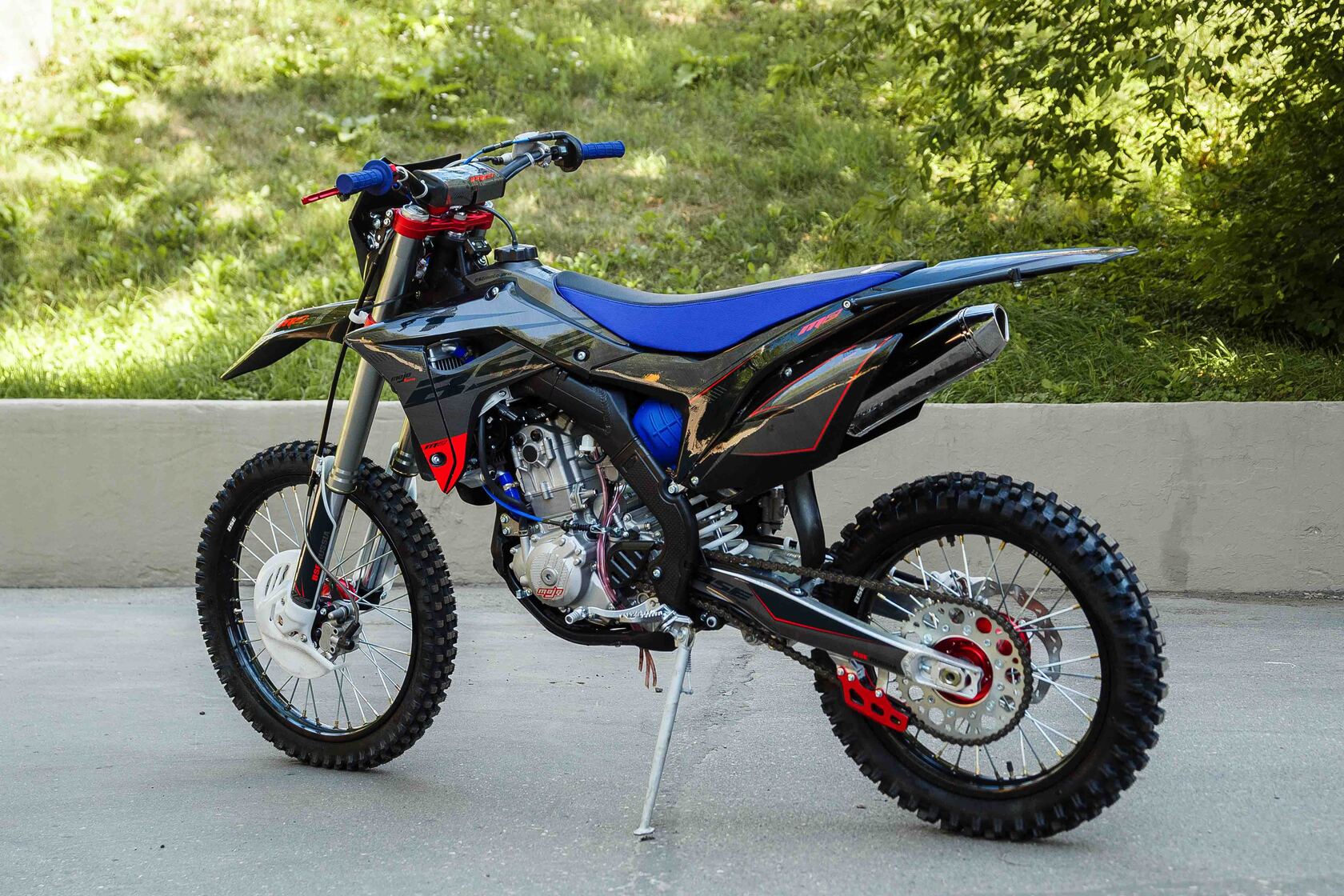 Комплектация Алюминиевый , толстостенный руль 28мм. Откидные рычаги тормоза и сцепления (алюминиевые). Алюминиевая ножка кик-стартера. Алюминиевая задняя звезда на 52 зубца. Цепь KMC 520 усиленная.Японские подшипники NTN, двойной выхлоп,бугель.