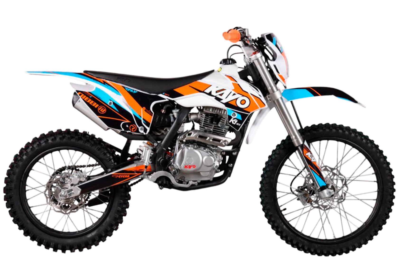 Мотоцикл KAYO K1-L 250 MX – “народная” версия внедорожного мотоцикла от компании KAYO 2024 модельного года. В его основе лежит проверенный временем двигатель, который обеспечил модели мировую популярность. Идеальный снаряд для внедорожного экстрима, представляющий собой оптимальный баланс производительности и технической оснащённости. Удобный, простой и надёжный мотоцикл, который полностью оправдывает свою цену.Мотоцикл оснащён одноцилиндровым 4-тактным двигателем воздушного охлаждения YX166FMM объёмом 223 см3, который выдаёт 17 л.с., что позволяет развивать большую скорость и с лёгкостью преодолевать трассы со сложным рельефом. Карбюраторная система подачи топлива с карбюратором PZ27 обеспечивает бесперебойную работу техники в самых жёстких условиях эксплуатации, простоту и лёгкость в обслуживании, а также неприхотливость к качеству топлива. Аппарат оснащён 5-ступенчатой механической коробкой передач с классической схемой “1-N-2-3-4-5”.Компания KAYO самостоятельно разработала раму и пластик на данном мотоцикле.Передняя подвеска – телескопическая регулируемая вилка перевёрнутого типа длиной 800 мм, задняя — нерегулируемый моноамортизатор длиной 360 мм, рассчитанный на высокие нагрузки до 900 LBS. Мотоцикл оснащён классическими спицованными колёсами диаметром 18 и 21 дюйм с прочными стальными ободами. Эффективное и безопасное замедление с любых скоростей обеспечивают гидравлические дисковые тормоза.Мотоцикл достаточно компактен и имеет вес всего 105 кг, поэтому он комфортен в эксплуатации одновременно и для мужчин среднего телосложения, и для девушек. Объём топливного бака составляет 6,7 л. Аппарат оснащён системой запуска двигателя при помощи кнопки электростартера или при помощи рычага кик-стартера.Высококачественная износостойкая резина с развитым протектором отлично держит дорогу на различных типах покрытия и в самых разных поворотах. Сиденье эргономичной формы покрыто антискользящим материалом. Яркая линзованная светодиодная фара позволяет кататься в тёмное время суток.K1 250 MX сочетает в себе отличные технические характеристики, комфорт и надёжность, что позволяет вам ощутить настоящую свободу на любой трассе.