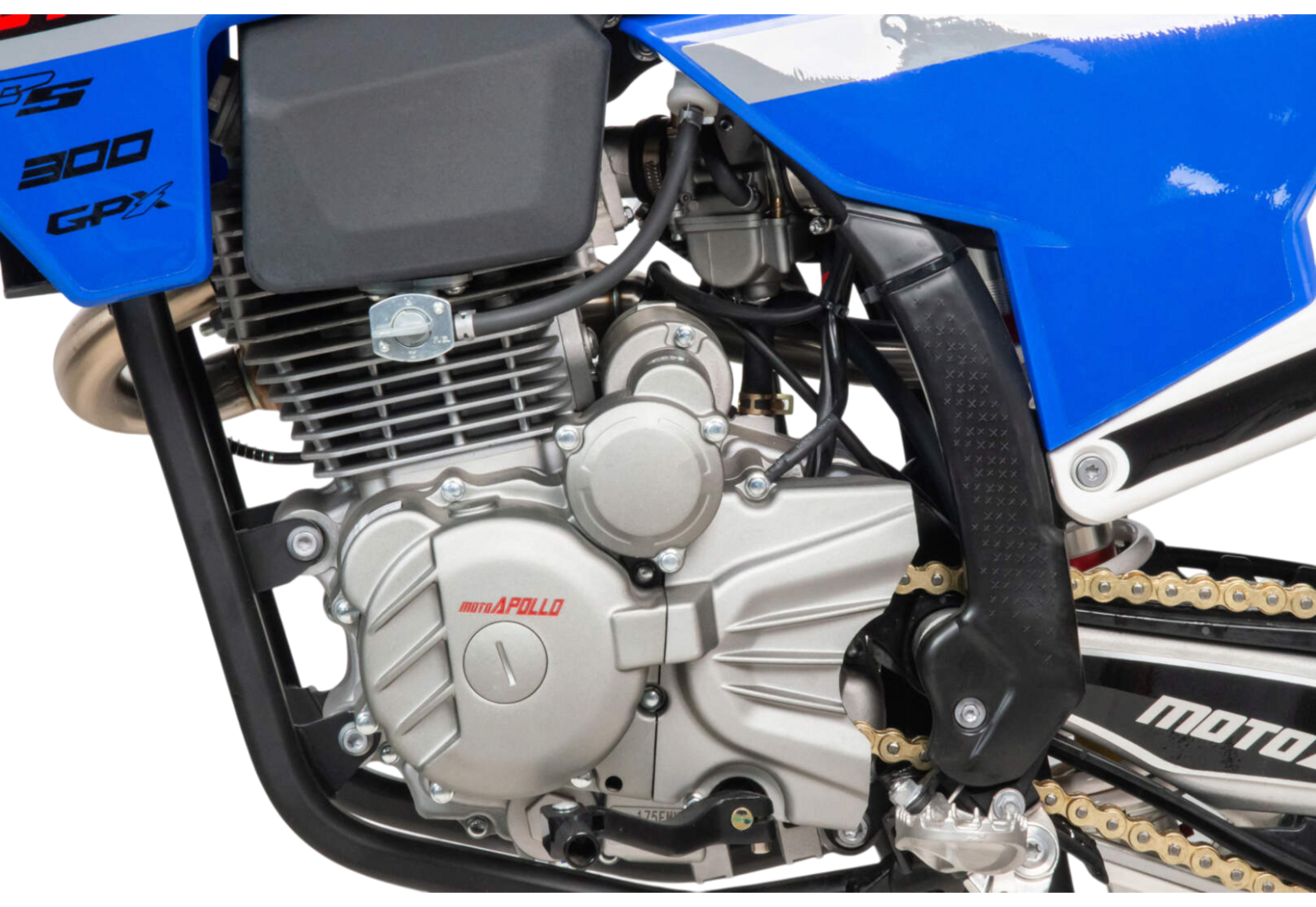 Moto Apollo F3 300 в этой конфигурации — это настоящий спортивный кросс, созданный без компромиссов для тех, кто живёт скоростью, прыжками и гонками по бездорожью. Несмотря на маркировку двигателя 175FMM, его реальный рабочий объём — 300 см³, а мощность составляет 25 лошадиных сил. Воздушное охлаждение, отсутствие балансирного вала и цепной привод ГРМ обеспечивают классическую кроссовую надёжность, минимальный вес и высокую ремонтопригодность прямо на трассе.