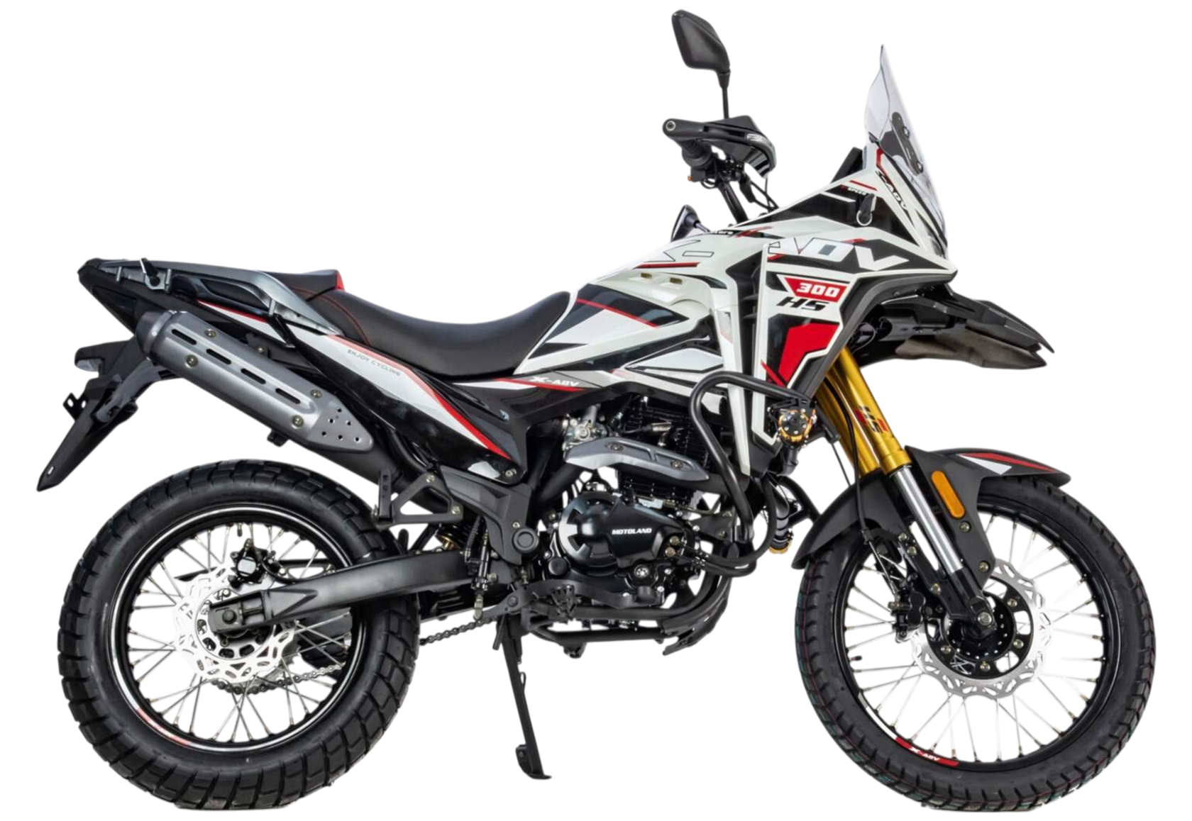 Motoland 300 является классическим турэндуро с укороченной колесной базой в размере 1340 мм. Он обладает более вертикальным углом наклона вилки около 70 градусов и прямой посадкой, что делает его идеальным выбором как для начинающих райдеров, так и для опытных мото путешественников. Особенностью такой геометрии является легкость управления на низких скоростях. В сочетании с мощным двигателем 175FMN-6 (с балансир.), выдающим 25 л. с., мы получаем комфортный мотоцикл для городской езды и путешествий как по асфальту, так и по пересеченной местности.Мотоцикл Motoland 300 характеризуется своим ярким и узнаваемым дизайном, прочной рамой из Cro-mo труб, обладающей высокими прочностными характеристиками, а также современной подвеской с выносными регулировками компрессии и отскока. Он оснащен мет. ободами , наличием электростартера, прямоточным выхлопом и LED оптикой с возможностью переключения между ближним и дальним светом, а так же отдельными линзовыми ходовыми огнямиДвигатель 175FMM-6 с баланс.