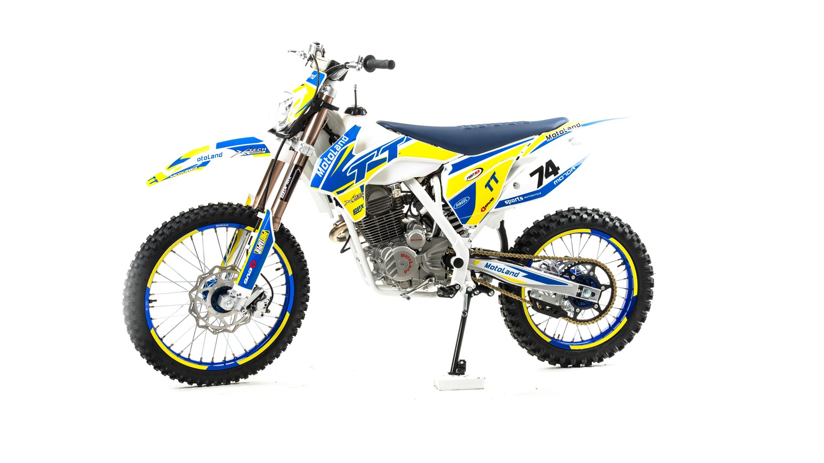 MotoLand TT 250 Новинка весны 2020 года.Надёжная техника из самых популярных компонентов оснащена Двигателем ZONGSHEN 172FMM с кикстартером и электростартером Мощностью 21 Л.С. на двигателе установлен Карбюратор NIBBI PE28.Это полноразмерный кроссовый мотоцикл его база по осям составляет 1430 мм., и габаритами 2180х800х1300 мм. Высота по седлу составляет 950 мм., что по сравнению с Моделью XT 250 ST 21/19 ниже порядка 20 мм. Что позволяет комфортно себя чувствовать райдерам среднего роста.За счет сбалансированной базы мотоцикл имеет отличную управляемость, а конструкция рамы и особенности настройки подвески GPX способствуют максимальному поглощению неровностей дорожного покрытия, а так же усиленная прогрессия на игольчатых подшипниках.Алюминиевые обода c антибуксаторами, усиленными спицами и ступицами CNC. На кроссовой резине Yuanxing 80/100-21 / 100/90-18На мотоцикле установлена обновлённая тормозная система аналог «brembo» с медными колодками , что обеспечивает отличные тормозные характеристики. Особенностью заднего тормоза является, лапка верхнего расположения с эксцентриковой регулировкой.Выпускной патрубок с резонатором Power Bomb имеет крепления на пружинах для снижения вибрации. Глушитель с уникальным дизайном прямоточного типа, полностью алюминиевый для облегчения веса.