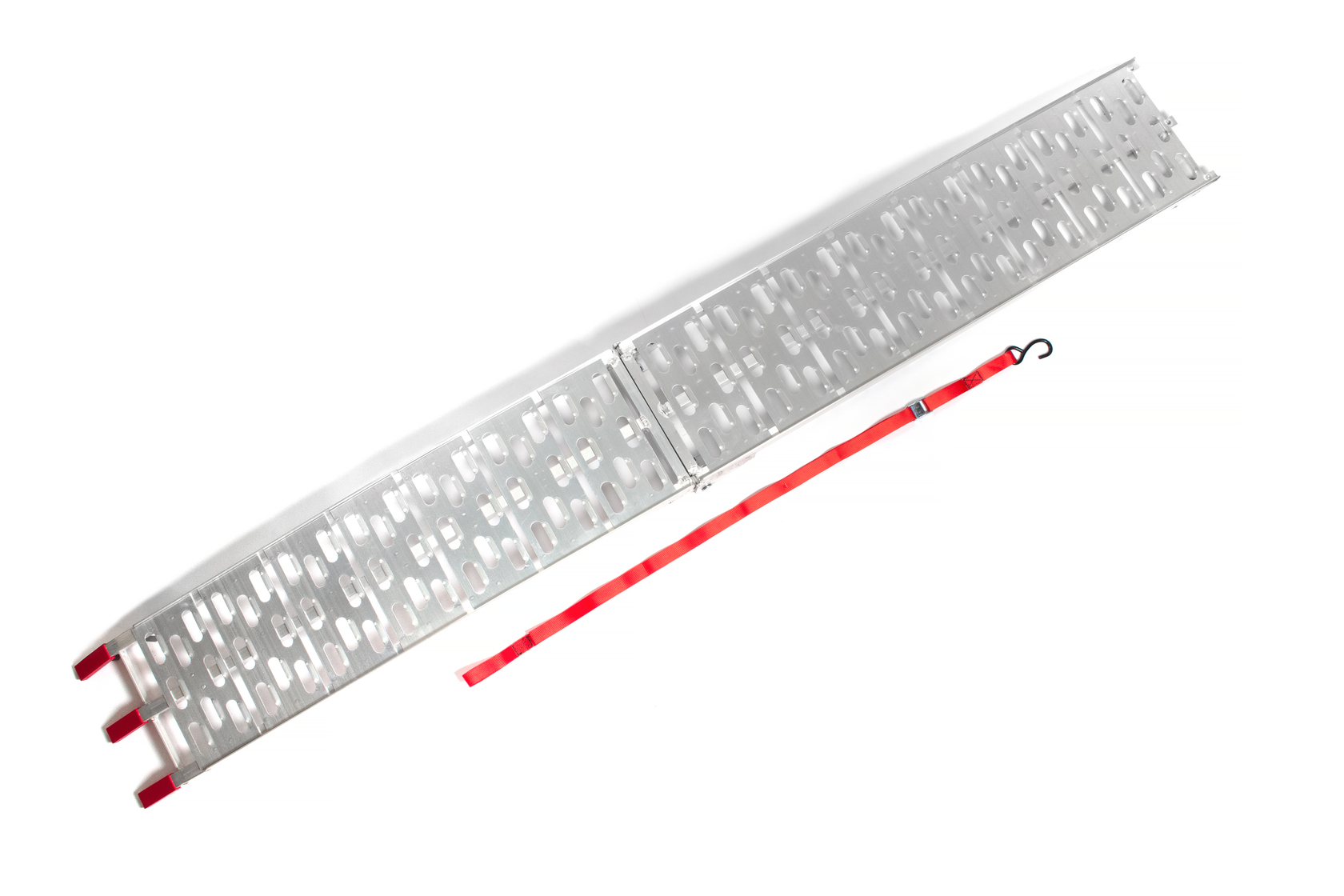 Удобный и легкий складной (переломный) трап из алюминия для погрузки и выгрузки мотоцикла, питбайка или квадроцикла. Максимальная допустимая нагрузка до 250 кг. Благодаря складной конструкции трап легко транспортируется и не занимает много места. В комплекте идет специальная стропа для фиксации трапа к транспортному средству для безопасного использования.