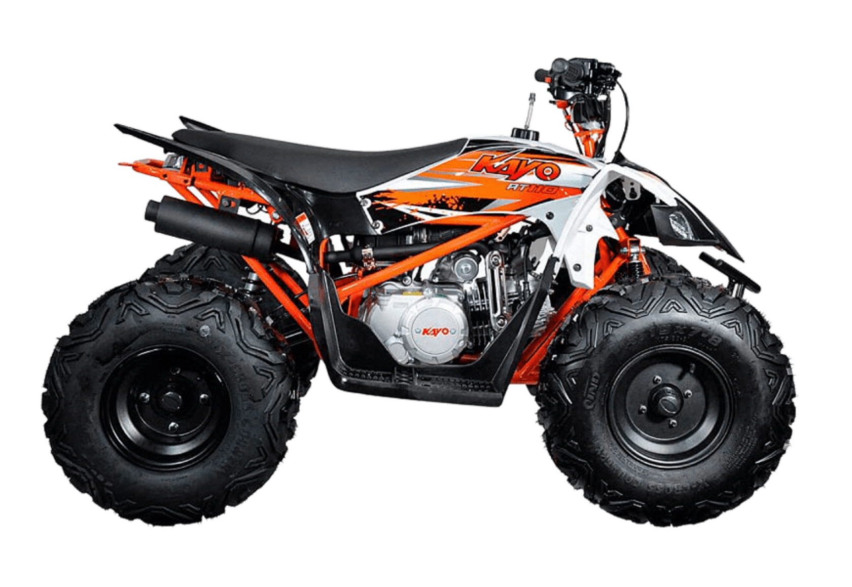 Представляем Вам надежный детский квадроцикл, выполненный в лучших традициях спортивных ATV. Вашему ребенку определенно понравится яркий и современный дизайн нового KAYO AT110. В целом, этот квадроцикл благодаря оптимальному сочетанию цены, мощности и качества, станет отличным вариантом в качестве первой техники для вашего ребенка.Модель AT110 оснащается 4-тактным двигателем KAYO с рабочим объемом в 110 куб. см. Вся мощность с помощью автоматической трансмиссии и цепного привода передается на заднюю ось. Квадроцикл очень прост и легок в управлении, поэтому у ребенка не возникнет проблем с освоением этой техники.Спереди используется двухрычажная подвеска. Сзади расположен моноамортизатор. Такая конфигурация может быть вам знакома по взрослым спортивным ATV. Тормоза гидравлические дисковые.На руле расположены все необходимые кнопки для управления функциями квадроцикла. Также здесь расположена кнопка аварийного выключения двигателя. Предусмотрен и ограничитель скорости.Квадроцикл Kayo AT110 построен на стальной трубчатой раме. Такая конструкция позволила сделать квадроцикл прочным и легким.