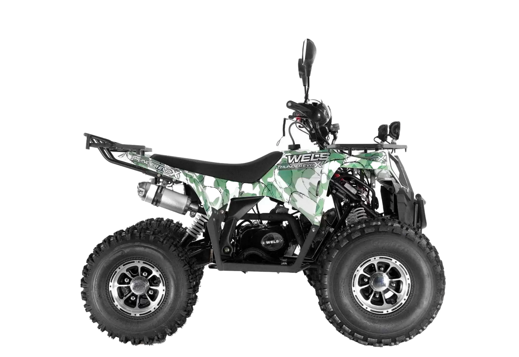 Стильная современная новинка 2019 года от компании WELS - квадроцикл для детей и подростков WELS THUNDER EVO X 125 предназначен для детей и подростков и обладает всеми необходимыми характеристиками, чтобы ребенок чувствовал себя на рулем настоящего квадроцикла, а его родители при этом были бы спокойны за безопасность юного пилота. ЛЮКСовая версия отличается от обычной наличием зеркал, дополнительной светодиодной оптики, спортивным глушителем, также квадроцикл укомплектован песочной резиной.125 кубового мотора вполне хватает для непоседливых гонщиков. Если же Вам кажется, что этого много - воспользуйтесь ограничителем скорости.Дисковые тормоза спереди и сзади обеспечат своевременную остановку перед препятствием.Защита рук в комплектации оградит ребенка от ударов веток и других помех.Песочная резина. Большие колеса 19,7-8, зад.: 18,9.5-8.Наличие укрепленных багажников спереди и сзади позволит установить на квадроцикл кофр и выезжать на природу с необходимым набором вещей и инструментов.Светодиодные фары для передвижения в темное время суток.Моточасы, светодиодные фары, звуковой сигнал, колпаки - все включено в комплектацию.Доступен в расцветках: черно-красный, бело-красный, живописно-красный, зеленый камуфляж