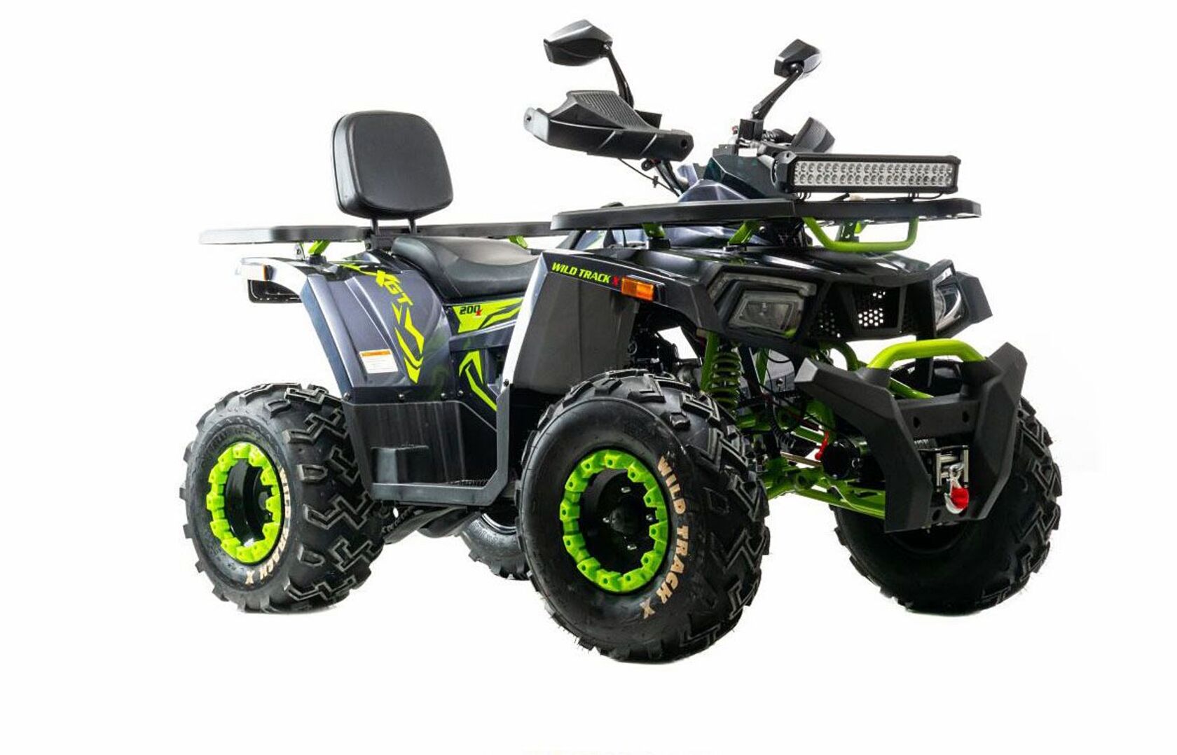 Квадроцикл 200 Wild Track X WINCH сочетает в себе удобство, простоту обслуживания и хорошую проходимость в самых разных условиях использования.Благодаря отлично настроенной подвеске, управление и передвижение на нем становится очень комфортным. Все неровности и кочки будут проглатываться без проблем, ведь на нем установлены колеса на 10 дюймов.Квадроцикл оснащен двигателем 161 QMK на 200 см3 c воздушно-маслянным охлаждением и автоматической коробкой передач с реверсом, дисковыми тормозами, ЖК панелью приборов, светодиодной оптикой с ДХО, ручным и электростартером.Он отлично подойдет для семейных покатушек, а также для рыбалки и охоты. Вы получите незабываемые впечатления от вождения.Отличия от модели 200 Wild Track X:- лебедка