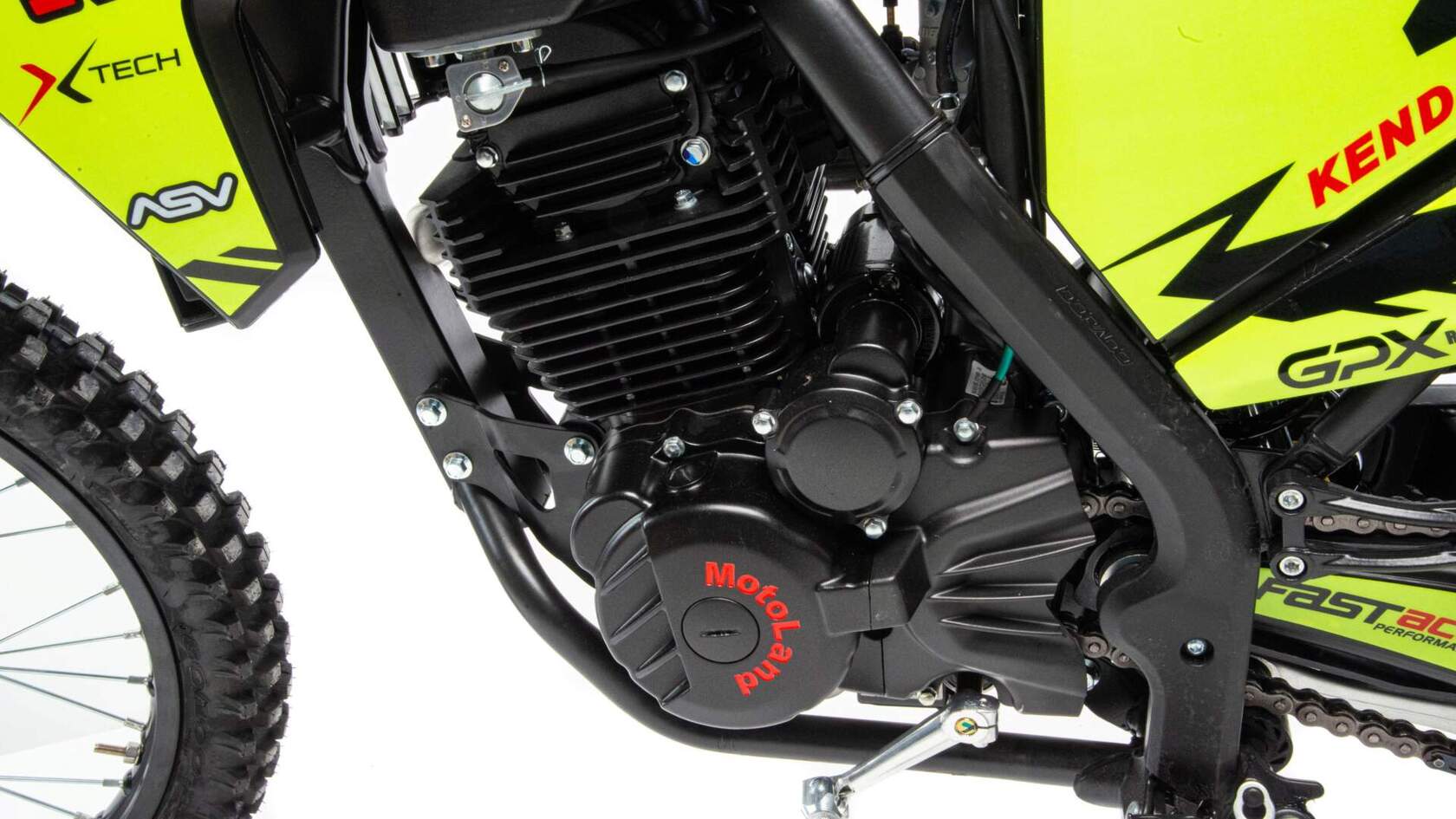 Мотоцикл Motoland X2 250 предназначен для езды по бездорожью и соревнований по мотокроссу. Имеет хорошую проходимость, прекрасно ведёт себя на песке и грунте, подходит для асфальтовых дорог. Оснащён двигателем 172FMM-3A мощностью 21 л.с. ,и карбюратором NIBBI PE 30.разгоняется до 120 км/ч. Выхлопная система из нерж. стали с резонатором "Рowerbomb", который увеличивает мощность на низких оборотах. Это одна из лучших моделей кроссовых мотоциклов по соотношению цены и качества.Подходит для новичков и любителей мотокросса. Идеален для бездорожья, его кроссовые шины (110-90) и (80-100) просто созданы для езды по мягкому и среднему грунту. Телескопическая вилка перевернутого типа позволяет легко преодолевать ямы, ухабы и другие неровности. Задняя подвеска маятниковая, с моноамортизатором.Мотоцикл доступен в ярком цвете "лайм" и отлично смотрится. Его дерзкий дизайн подчёркивает неуступчивый спортивный характер байка.Motoland X2 250 весит 120 кг, выдерживает нагрузку до 150 кг. Рама полудуплексная стальная. Прочный облицовочный пластик не ломается при сгибании, защищает от грязи. Надёжно закрепленный руль имеет переменное сечение: 28 мм в месте крепления и 22 мм на концах под грипсами, а также короткоходную ручку газа. Колёса на алюминиевых ободах, оснащены усиленными спицами и антибуксаторами, размер заднего колеса — 18 дюймов, переднего — 21 дюйм, а так же усиленными полыми осями.Для запуска двигателя можно использовать электростартёр или кикстартёр. Система зажигания электронная (CDI). Механическая трансмиссия содержит 5 передач. Отличный запас хода: объём топливного бака — 6 л, расход топлива — 5 л на 100 км. Передняя фара светодиодная, обновленного дизайна, легко включается поворотом замка зажигания и позволяет ездить в сумерках и темноте.Так же мотоцикл оснащён надёжными передними двухпоршневым тормозным суппортом и задними тормозами с однопоршневым тормозным суппортом, задним багажником, приборной панелью, поворотниками и зеркалами. Удлиненное сиденье, с антискользящим покрытием. Тормозные диски крепятся на 4 болтах, диаметр заднего тормозного диска 215 мм, переднего — 235 мм. Тормозной шланг армированный.