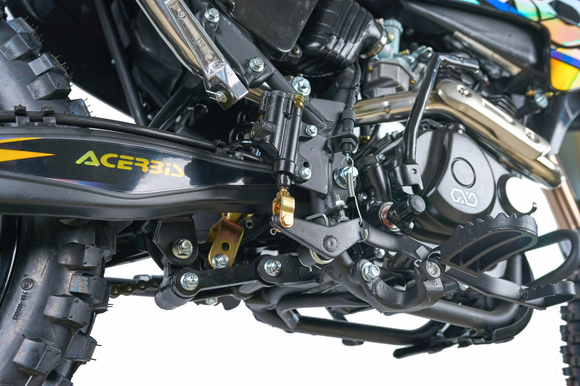 ДвигательДвигатель ZS165FMM - 4-тактный двигатель воздушного охлаждения объёмом 223 куб см с двумя клапанами, оснащён балансировочным валом, благодаря которому уменьшается избыточная вибрация, передаваемая от двигателя на раму и общую конструкцию техники. Характеризуется хорошей тягой с самых низов и лёгким пуском с помощью электростартера. Двигатель отлично зарекомендовал себя в качестве надёжного, универсального, неприхотливого мотора с хорошими характеристиками.РамаРама мотоцикла OXO производится из труб шестигранного сечения хром-молибденовой стали, которая является очень прочной и легкой. Геометрия рамы, благодаря правильно выверенному центру тяжести и углу наклона вилки - способствует наилучшей управляемости устойчивости мотоцикла на низкой скорости.ПодвескаПередняя вилка перевернутого типа. Мотоцикл LITE 250 снабжен моноамортизатором, который соединен посредством системы рычагов прогрессии. Система прогрессии, обеспечивает равномерную, мягкую работу и увеличивает длину рабочего хода подвески.КолесаРазмер передней покрышки: 80/100-21. Размер задней покрышки: 120/100-18. Они прекрасно себя ведут по песку и грязи, что позволяет райдеру отлично показать себя на пересеченной местностиТормозная системаТормозная система мотоцикла - полностью гидравлическая с армированными шлангами. Спереди и сзади установлен двухпоршневой суппорт. Данная конфигурация тормозных механизмов, позволит быстро и безопасно остановиться с максимальной скорости даже на бездорожье.РульВажная часть современного эндуро мотоцикла - усиленный руль переменного сечения Мотоцикл укомплектован панелью приборов.