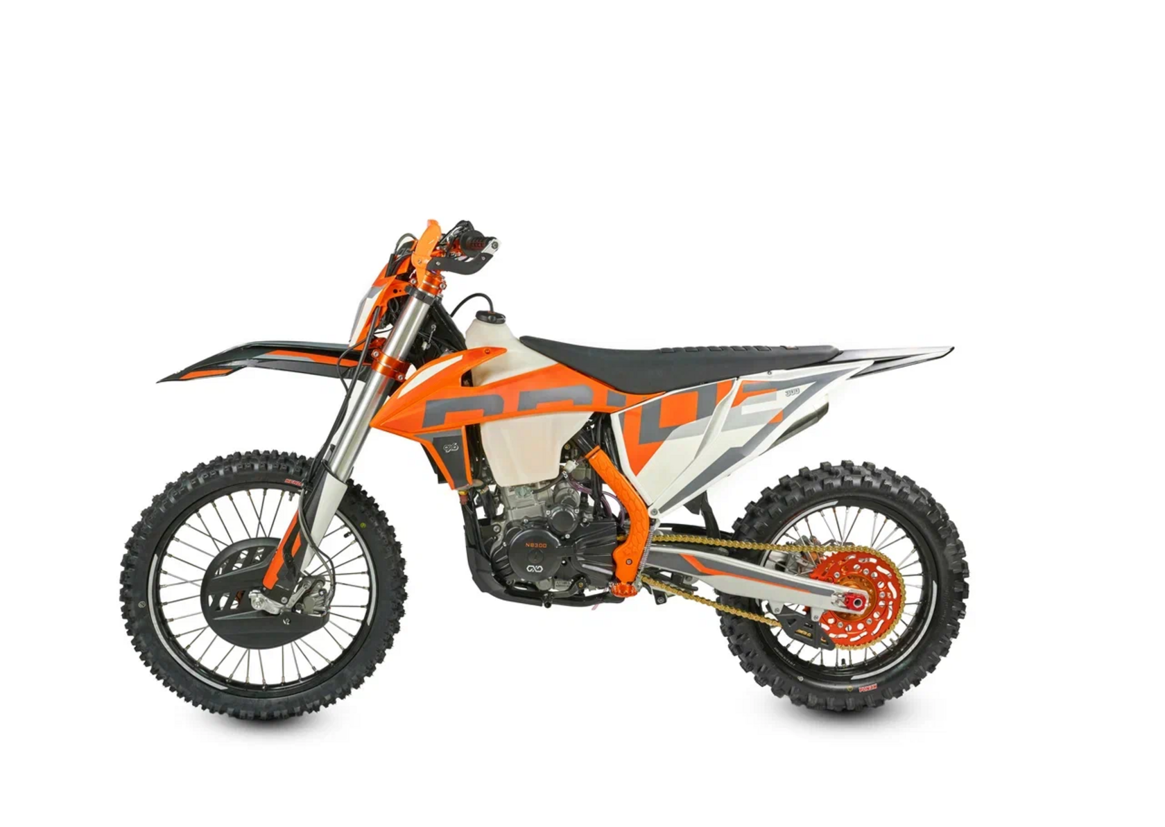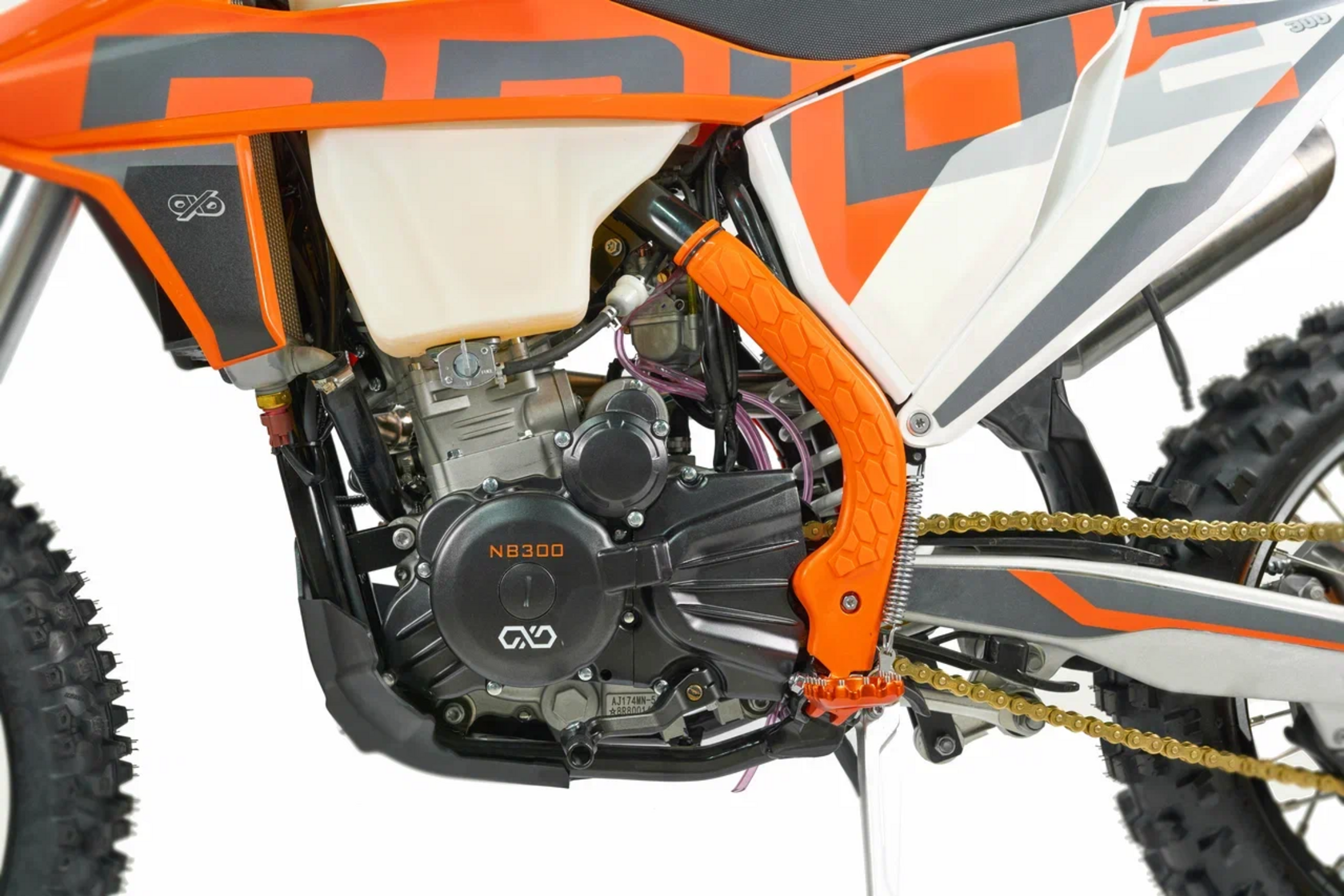 КомплектацияЭлектронная приборная панель, противоскользящее сиденье, защита рамы от протирания ботинками, подножки «AJ1» (алюминий 6063 с шипами), подножка боковая «AJ1» (алюминий 7075-Т6), невозгораемый воздушный фильтр «AJ1» – Twin Air с увеличенной площадью, ведомая звезда «AJ1» (520, алюминий 7075-Т6), защита рук, грипсы OTOM/Lock-On, передние и задние буксаторы «AJ1», откидные алюминиевые рычаги 270, алюминиевая лапка КПП, пульт света КТМ, LED фара 5 линз, моточасы, фрезерованная траверса X trigДвигательМодель оснащена 1-цилиндровым 4-х тактным двигателем ZONGSHEN ZS174MN-5A с водяным охлаждением и балансировочным валом объёмом 279,6 см3, который выдаёт 27 л.с.ПодвескаПередняя вилка "MNT" перевернутого типа T7 48- 910mm с регулировкой на сжатия и отбой. Моноамортизатор "MNT" также с регулировками. Система прогрессии, обеспечивает равномерную, мягкую работу и увеличивает длину рабочего хода подвески. Также ось крепления маятника совпадает с осью крепления ножки. Это существенно улучшает развесовку мотоцикла.КолесаСпереди и сзади установлены антибуксаторы бренда "AJ1", которые притягивают покрышку к ободу, позволяя ездить по бездорожью при низком давлении в камерах, не давая покрышке проворачиваться во время езды. Размер передней покрышки: 80/100 R21. Размер задней покрышки: 120/90-R18. Модель комплектуется "жирной" резиной "KENDA". Все эти характеристики позволяют мотоциклу отлично себя чувствовать в песке и грязи.Тормозная системаПолностью гидравлическая с армированными шлангами. Спереди и сзади установлен двухпоршневой суппорт. Диаметр дисков перед/зад, мм: 260/220. Данная конфигурация тормозных механизмов, позволяет быстро и безопасно оттормаживаться даже в самых непростых условиях.Сухой вес мотоцикла 117кг
