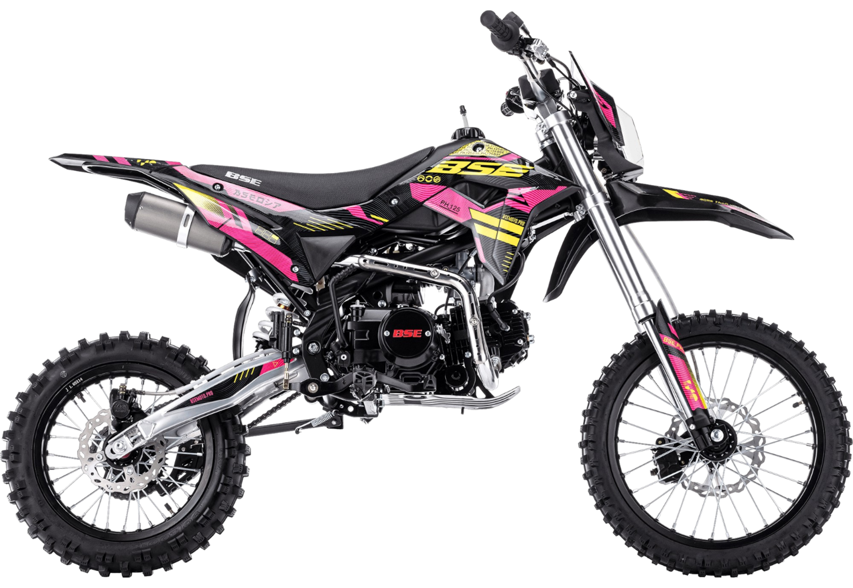 Питбайк BSE PH125 на колесах 17/14 дюймов – один из самых популярных, надежных и продаваемых питбайков 125 куб см среди китайских производителей! Этот классический питбайк объёмом 125 см3 обладает рядом модификаций и полезных усовершенствований, которые дополняют его функционал и отличают от конкурентов. PH125 оснащен колесами классическим для питбайка размером колес 17/14. Основа PH125 - рама из хромомолибденовой стали повышенной жесткости с литыми усилителями - фирменный знак качества завода BOSUER! Cиловая установка питбайка – надежный, тяговитый и мощный 4-тактный двигатель Zonghshen 125 куб см с воздушным охлаждением и мощностью 10 лс. Питает мотор карбюратор Jingke PZ 26. Питбайк оснащен 4-ступенчатой механической трансмиссией. Запуск мотора осуществляется при помощи электростартера или кик-стартера. Подвески с большими ходами: передняя - телескопическая вилка перевёрнуто типа, задняя- моноамортизатор. "Злая" резина, Мощная тормозная система HSK Racing, японские колесные подшипники NTN, усиленная цепь 428 Gold, защита мотора - питбайк полностью укомплектован всем необходимым для покатушек и гонок.