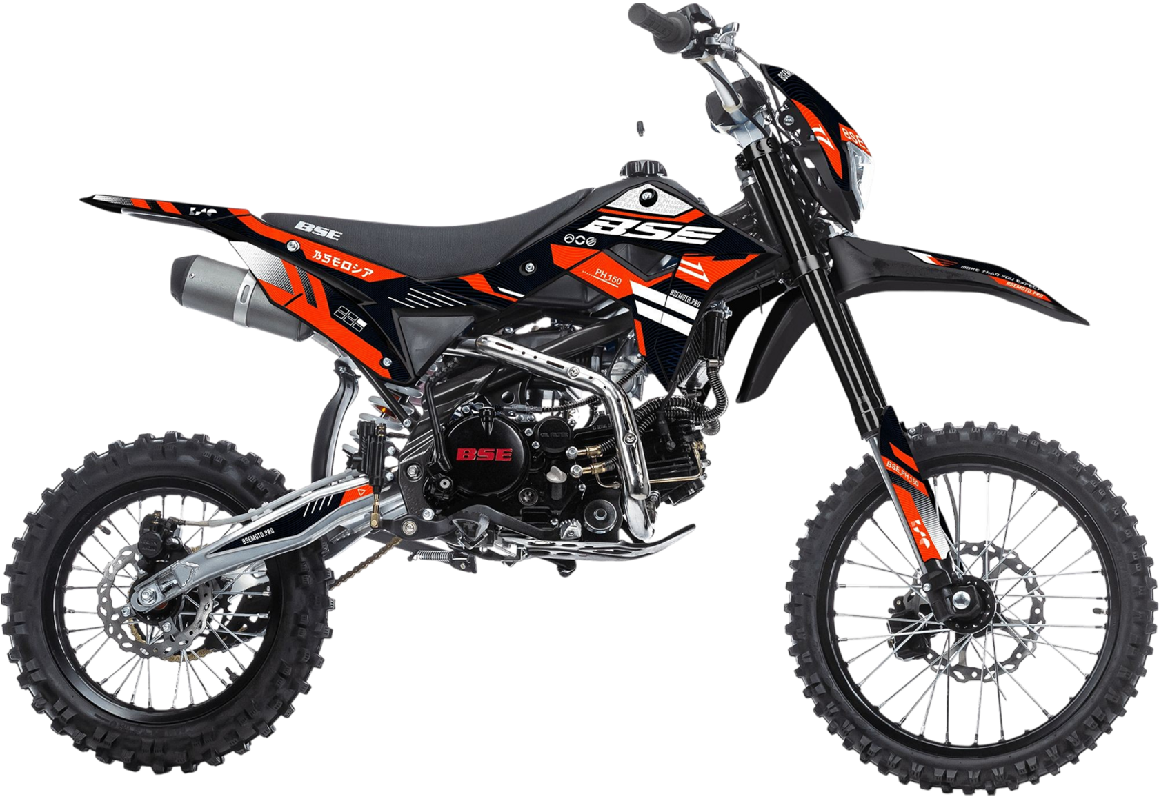 BSE PH150 – король питбайков в линейке BSE.PH150 на колесах 17/14 оснащен самым мощным двигателем среди питбайков BSE и самой богатой комплектацией.Основа PH150 - рама из хромомолибденовой стали повышенной жесткости с литыми усилителями — фирменный знак качества завода BOSUER! Силовая установка питбайка — надежный и тяговитый 4-тактным двигателем YX объёмом 150 см3 с воздушным охлаждением. Максимальная мощность – внушительные 15 л.с. Питает мотор карбюратор MIKUNI VM26. Питбайк оснащен 4-ступенчатой механической трансмиссией. Запуск мотора осуществляется при помощи электростартера или кик-стартера. Подвески с большими ходами: передняя — телескопическая вилка перевёрнуто типа, задняя — моноамортизатор.LED фара головного света, "злая" резина, мощная тормозная система HSK Racing, японские колесные подшипники NTN, защита мотора, руль ProTaper - питбайк полностью укомплектован всем необходимым для покатушек и гонок.PH150 – профессиональный выбор самого продвинутого "питбайкера".
