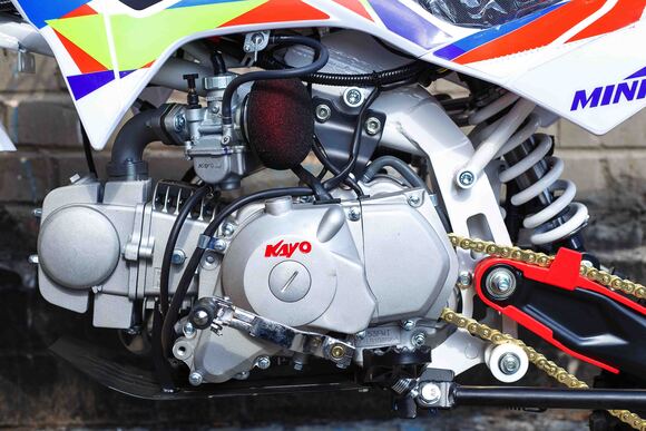 Питбайк KAYO Mini К125EM 14/12 – идеальный снаряд для юных экстремалов, который можно использовать на лёгких кроссовых трассах и дорогах с различным покрытием. Подходит для детей от 10 лет, желающих освоить технику езды на внедорожном мотоцикле. Удобный, простой и надёжный мотоцикл, который полностью оправдывает свою цену.Одноцилиндровый 4-тактный двигатель воздушного охлаждения производства KAYO объёмом 125 см3, выдаёт 9 л.с. Карбюратор NIBBI PE19 обеспечивает бесперебойную работу техники в самых жёстких условиях эксплуатации, простоту и лёгкость в обслуживании, а также неприхотливость к качеству топлива. Питбайк оснащён механической 4-ступенчатой коробкой передач с формулой “N-1-2-3-4”.Аппарат имеет вес всего 70 кг. Усиленная рама из хром-молибденового сплава и подвеска позволяют эффективно амортизировать удары при езде по неровностям и препятствиям на трассе. Передняя подвеска —телескопическая вилка длиной 625 мм, задняя —моноамортизатор 280 мм. Рама и пластик разработаны фирмой KAYO. Мотоцикл оснащён классическими стальными спицованными колёсами диаметром 14 дюймов спереди и 12 дюймов сзади. Эффективное и безопасное замедление с любых скоростей обеспечивают гидравлические дисковые тормоза марки HSK.Высококачественная износостойкая резина с развитым протектором отлично держит дорогу на различных типах покрытия. Аппарат оснащён системой запуска двигателя при помощи кнопки электростартера или при помощи рычага кик-стартера.Если вы ищете послушный, компактный, шустрый, красивый питбайк для своего малыша, считайте, что вы его нашли. Это один из лучших мотоциклов для обучения и первых шагов в эндуро и мотокроссе. Он отлично подойдёт как для гонок на трассе, так и для покатушек по пересечённой местности.