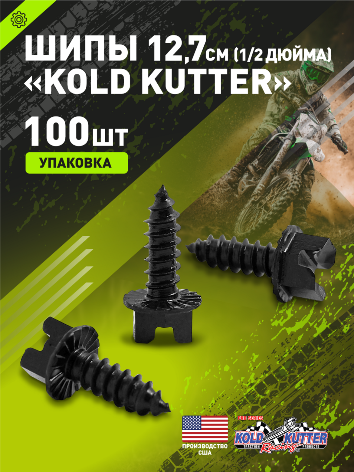 • Вкручивающиеся шипы KOLD KUTTER для мотоциклов, квадроциклов (ATV) и снегоходов. Средний размер шипа 1/2 дюйма (12 мм) с резьбой M8. Упаковка содержит 100 штук. Обеспечивают кардинальное улучшение сцепления на льду, укатанном снегу и мокрых обледенелых дорогах. Незаменимы для ошиповки как пневматических шин, так и резиновых гусениц снегоходов и мотобуксировщиков.