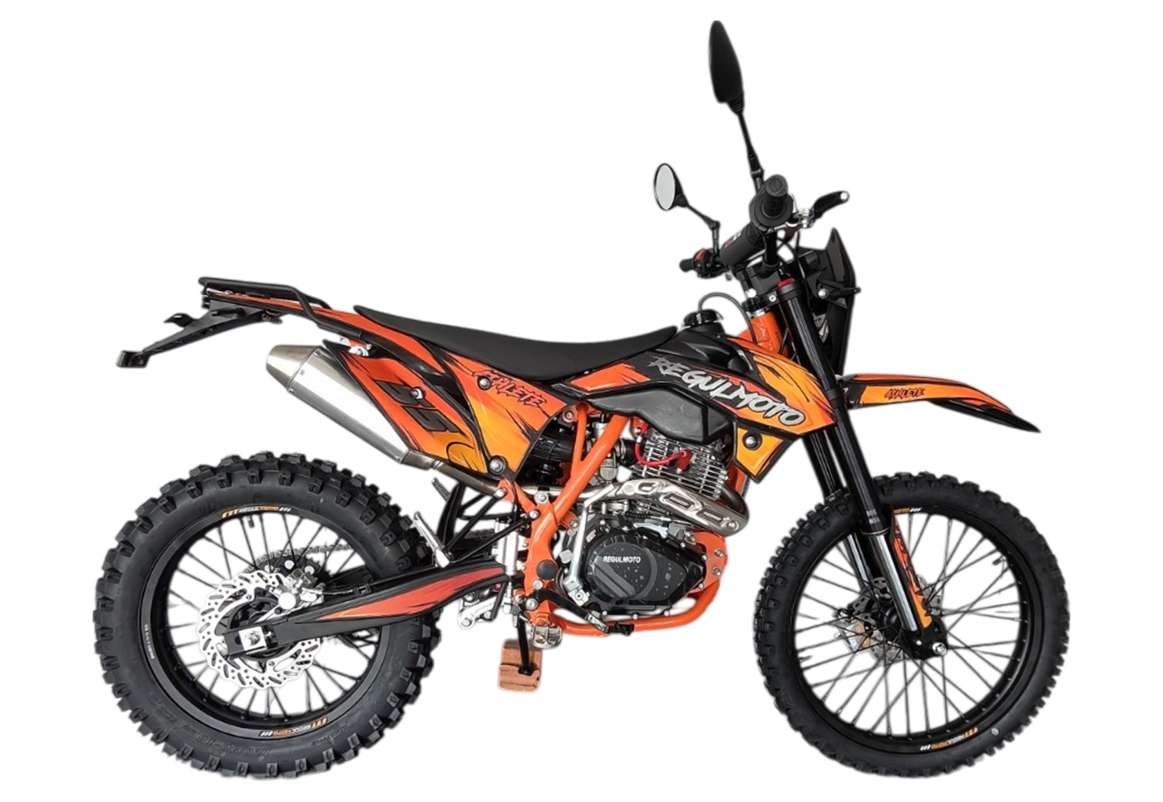 Regulmoto Athlete – доступный широкому кругу мотолюбителей мотоцикл многоцелевого назначения. Данную модель отличают небольшая колесная база и небольшой собственный вес, что позитивно сказывается на простоте управления техникой на бездорожье. Купить мотоцикл REGULMOTO Athlete вы сможете, оформив онлайн-заявку на сайте или связавшись с менеджерами нашей компании.В раме байка устанавливается надежный 4-тактник Zongshen 175FMM-3A воздушного охлаждения с электростартером и 5-ступенчатой трансмиссией. Двигатель, работающий с карбюратором Nibbi PE30, , что для такого компактного аппарата больше чем достаточно.В отличие от бюджетной мототехники, когда производители стараются максимально сэкономить на подвеске, система амортизации Regulmoto Athlete рассчитана на полноценное использование на бездорожье: телескопическая вилка-перевертыш собрана на нерегулируемых амортизаторах длиной 800 миллиметров, конструкция задней части подвески представлена маятником с системой прогрессии и моноамортизатором с регулировкой преднатяга пружины.Не смотря на доступность, мотоцикл отличается продуманным подбором комплектующих, что делает его эксплуатацию более комфортной. В стоке уже установлены фара головного света, ручка акселератора с коротким ходом, буксаторы на обоих колесах, замок зажигания и багажник. Еще одной особенностью данной модели является наличие у Regulmoto Athlete ПТС – байк можно поставить на учет и передвигаться по дорогам общего пользования, поставив необходимое дополнительное оборудование.Основные технические моменты Regulmoto Athlete:• Двигатель ZS 175FMM-3A