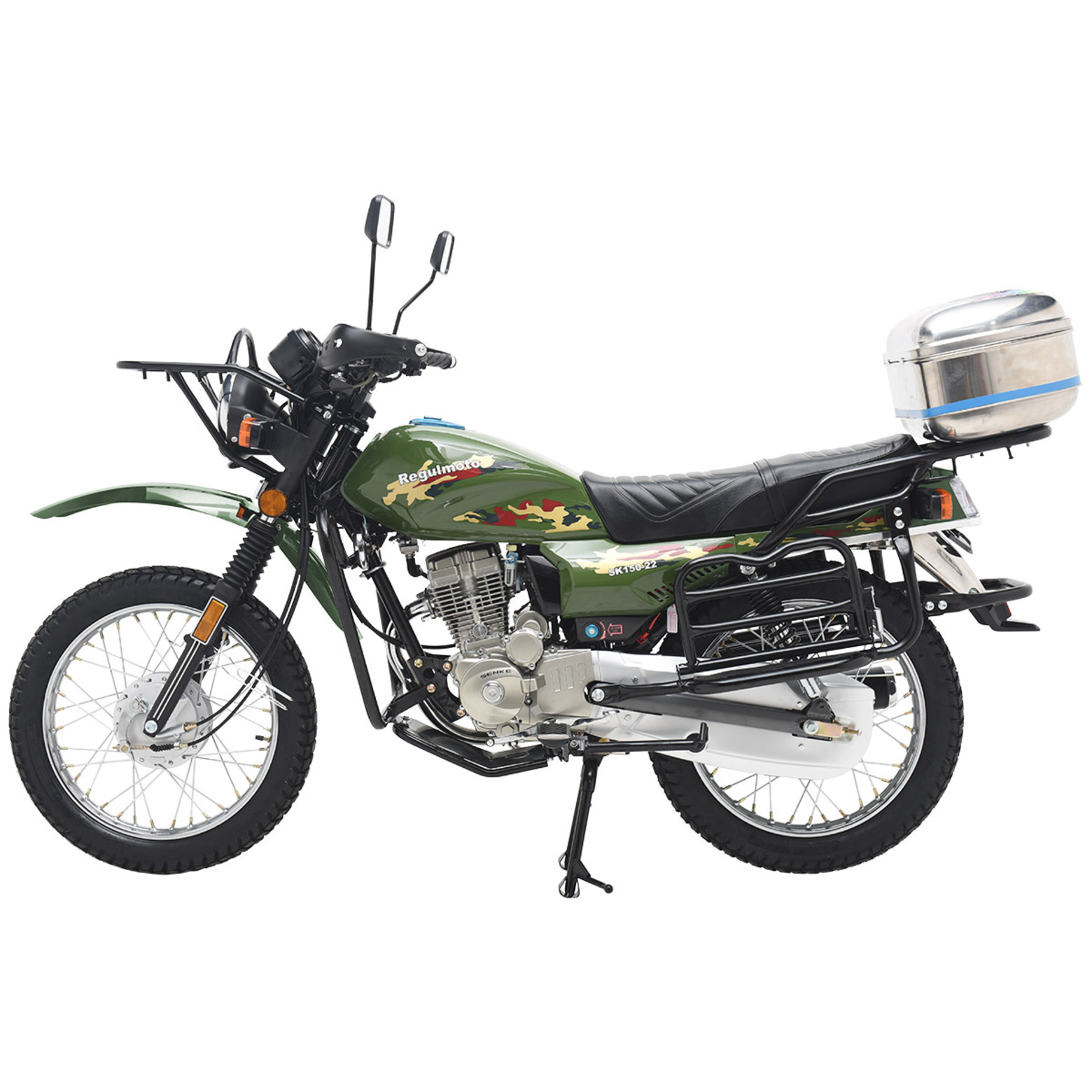 Мотоцикл Regulmoto SK 150-22 – классический «дорожник» с надежным и экономичным малокубатурным двигателем. Данная модель изготавливается на собственных мощностях крупного китайского производителя Senke.Несмотря на классический внешний вид Regulmoto SK 150-22 отличается достаточно интересным и продуманным дизайном. В раме мотоцикла установлен одноцилиндровый 4-тактник с воздушным охлаждением с рабочим объемом в 149 см3. Двигатель можно запускать как кнопкой электростартера, так и при помощи традиционного кик-стартера. В целом байк выглядит лаконичным и современным – еще одной приметой актуальных трендов стали спицованные диски переднего 18-дюймового и заднего 18-дюймового колес. Характерная для «дорожников» подвеска представлена телескопической вилкой спереди и двумя амортизаторами сзади.Широкое комфортное сиденье и вместительный бак Regulmoto SK 150-22 недвусмысленно указывают на назначение мотоцикла, окончательную ясность вносят багажник, складывающиеся пассажирские подножки и наличие мощной центральной подножки. Безопасность эксплуатации на дорогах общего пользования обеспечивают обязательный комплект зеркал заднего вида и светового оборудования, включающего фару головного света, светодиодные поворотники и стоп-сигнал. Этот мотоцикл станет отличным выбором в качестве транспортного средства на каждый день и позволит своему обладателю с комфортом решать широкий круг повседневных задач.